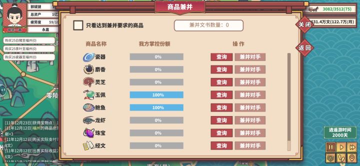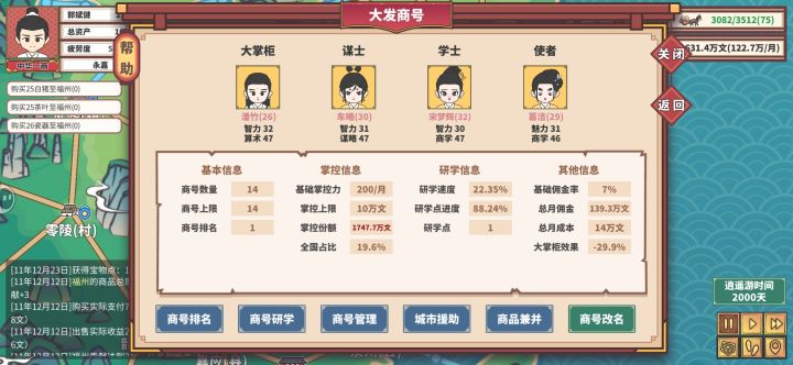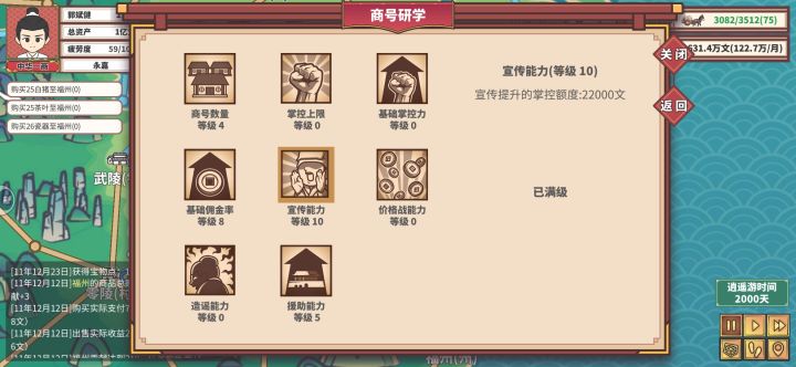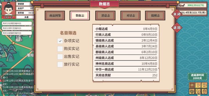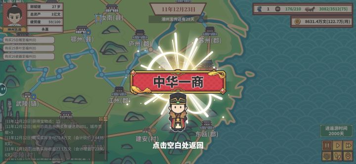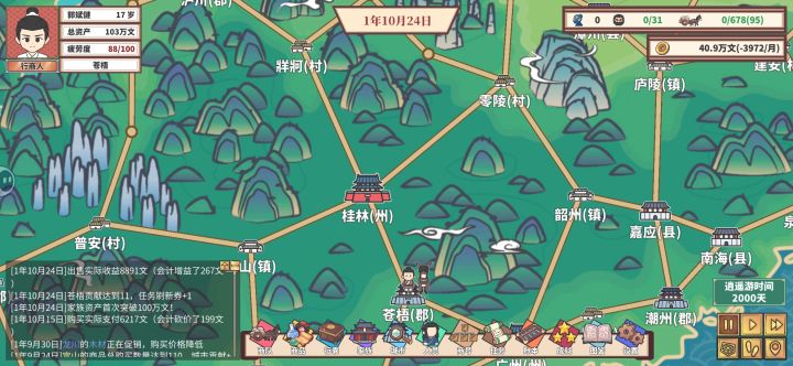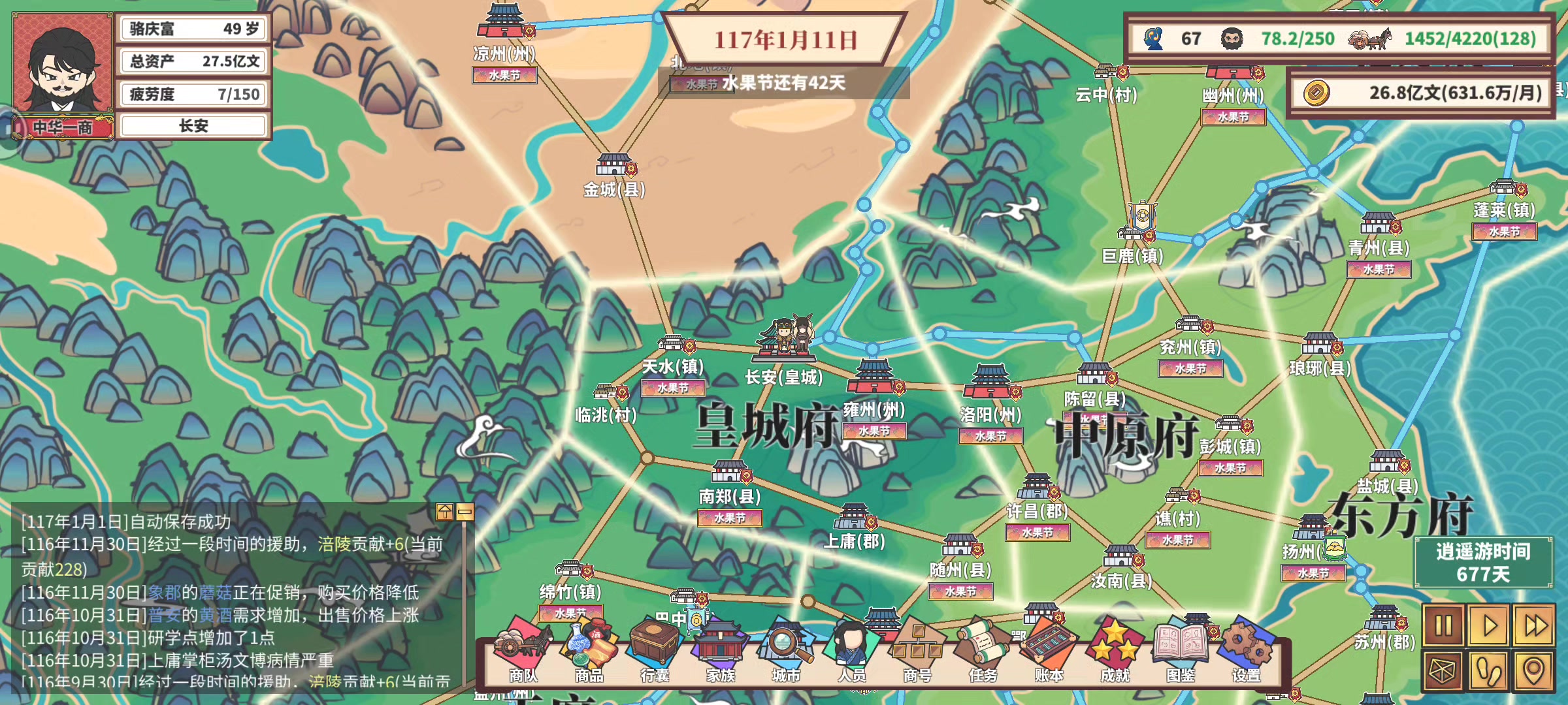 感觉后续没什么好玩的了,给大家分享一下心得,写多了没人看只写4点:第一,不要用马车,哪怕后期马车也是非常不好用的,开局先6-10级牛车等7-8台车的时候换15级驴车。第二,就是赚钱还得靠节日和长途运送到西域府,西域的宝物是最强宝物,西域内部互相送也很赚钱。第三,钱别投入到策略上了,节约点钱先到州府开商会,ai很蠢会按照先村后镇一步步开上去,你要先州后郡。第四,30岁迁户口到首都再结婚,只要