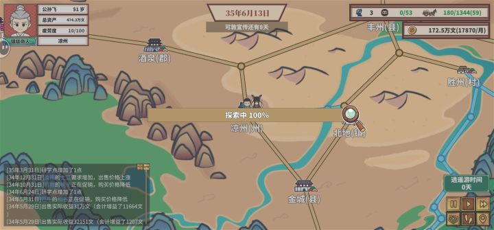 感觉后续没什么好玩的了,给大家分享一下心得,写多了没人看只写4点:第一,不要用马车,哪怕后期马车也是非常不好用的,开局先6-10级牛车等7-8台车的时候换15级驴车。第二,就是赚钱还得靠节日和长途运送到西域府,西域的宝物是最强宝物,西域内部互相送也很赚钱。第三,钱别投入到策略上了,节约点钱先到州府开商会,ai很蠢会按照先村后镇一步步开上去,你要先州后郡。第四,30岁迁户口到首都再结婚,只要