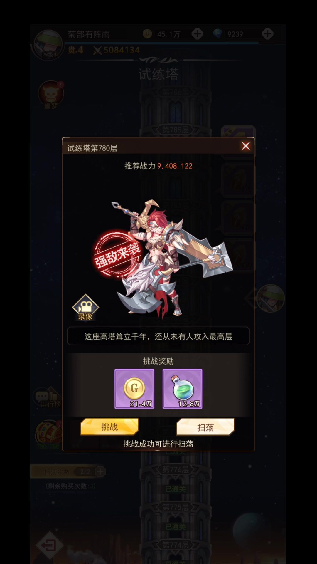 13星单C雷娜,杀到760层,(761层雷娜第一回合就挂了根本打不过,花木兰,吕布,琴,一回合集火主c,直接升天),一些心得,如果有宫本的情况下12星雷娜应该也可以爬到730-760左右,因为宫本是单攻,是可以减员的,如果不带宫本或者赵云的情况下,是很难13星左右强度爬到750层左右的,如果是单一路线,只能靠星级去堆,其实这游戏的天花板应该是220w战力,这游戏上限比较高,主c差不多220w战力的