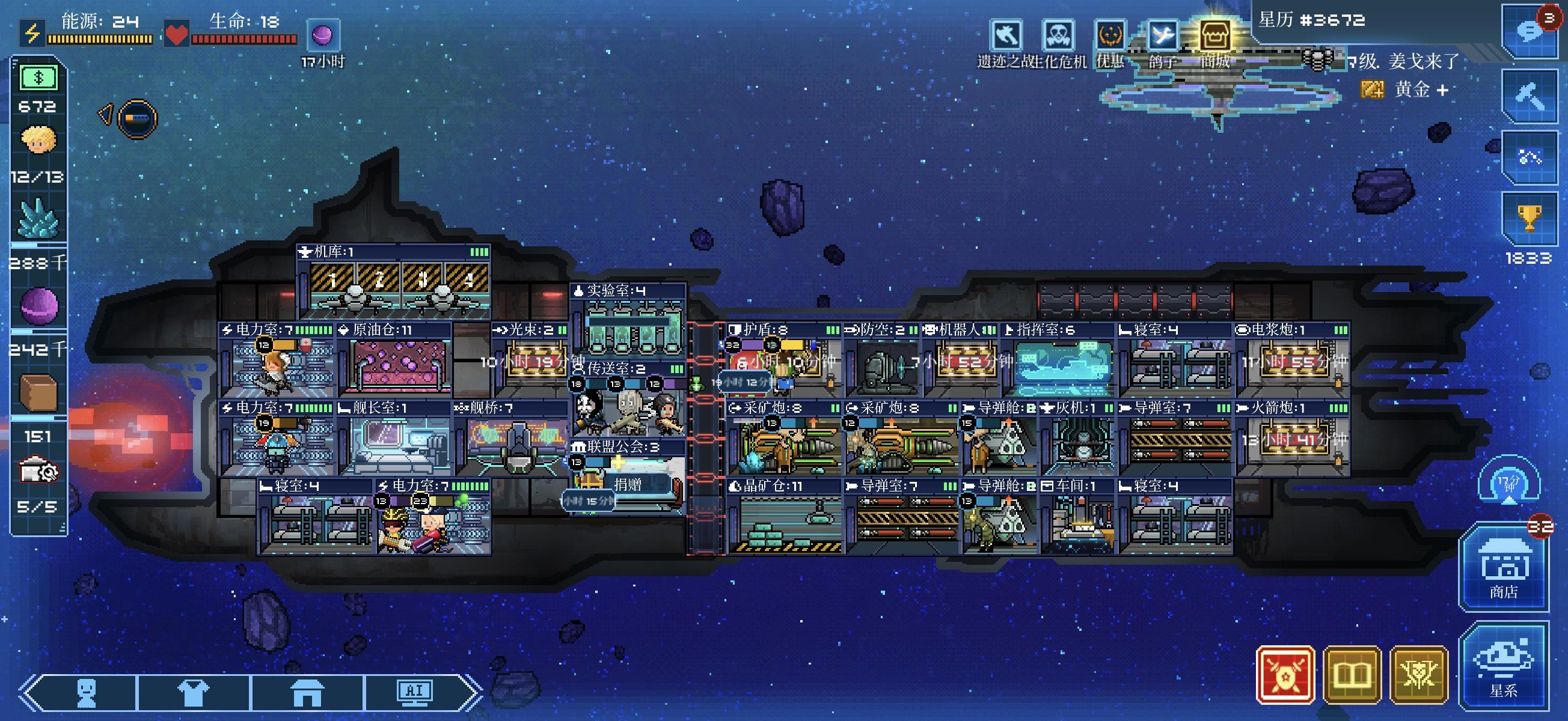 - 房间升级:电力室>寝室>护盾>指挥室>传送室>武器房间;