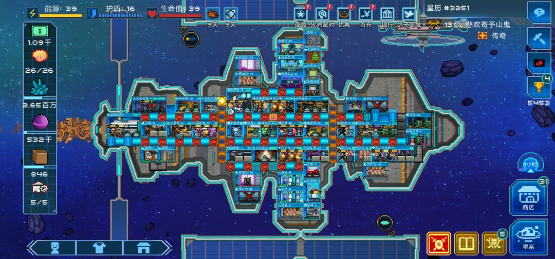 本篇攻略标题为:12,13本玩家每天在玩什么,萌新应该怎么玩这款游戏(1)。 初入超时空星舰,我们都被像素风的星舰题材所吸引。不同于其它画风精致的星舰题材游戏,与其说是打造一艘自己的星舰,不如说是拿系统设计好的瓶装玩具组件“拼”出一艘艘模板星舰去打团,这个xxx号,那个xxx号。超时空星舰利用像素风的精致,让玩家自己灵活的打造属于自己的星舰。就像大家拼好一个玩具后会拿着它到处晃,测试他的强度,超