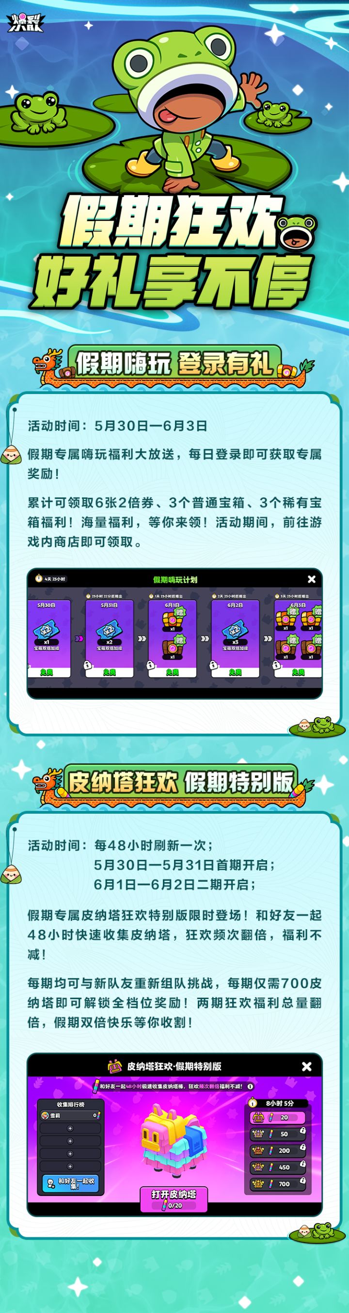 各位队长们好呀!恭喜以下幸运队长中奖哦~请您在6月12日23:59之前联系阿爆小助手【QQ:3566774082 】进行兑奖核奖,超过期限将视为自动放弃,无法兑换奖励。 皮塔纳假期特别版,派对组队匹配中!各位队长们好呀,假期将近,皮纳塔狂欢也迎来了全新版本——假期专属皮纳塔特别版,本次狂欢频次翻倍,福利不减!仅需700皮纳塔即可解锁全档位奖励!本次更是两期齐登场哟~5月30日-5月31日首