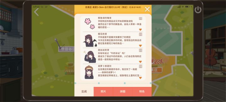 其中 目黑区:香煎鸡腿排、意式番茄肉酱面、鲷鱼烧能通过升等级获得(可额外获得樱花奶昔、甜丝丝奶昔、胡萝卜鲜蔬饮) 涩谷区:章鱼烧、蛋包饭都能通过升级获得(没必要专门去) 新宿区:寿司、厚蛋烧都能通过升级获得(没必要专门去) 中野区:咖喱饭能通过升级获得(可额外获得巧克力奶昔、特调番茄饮)