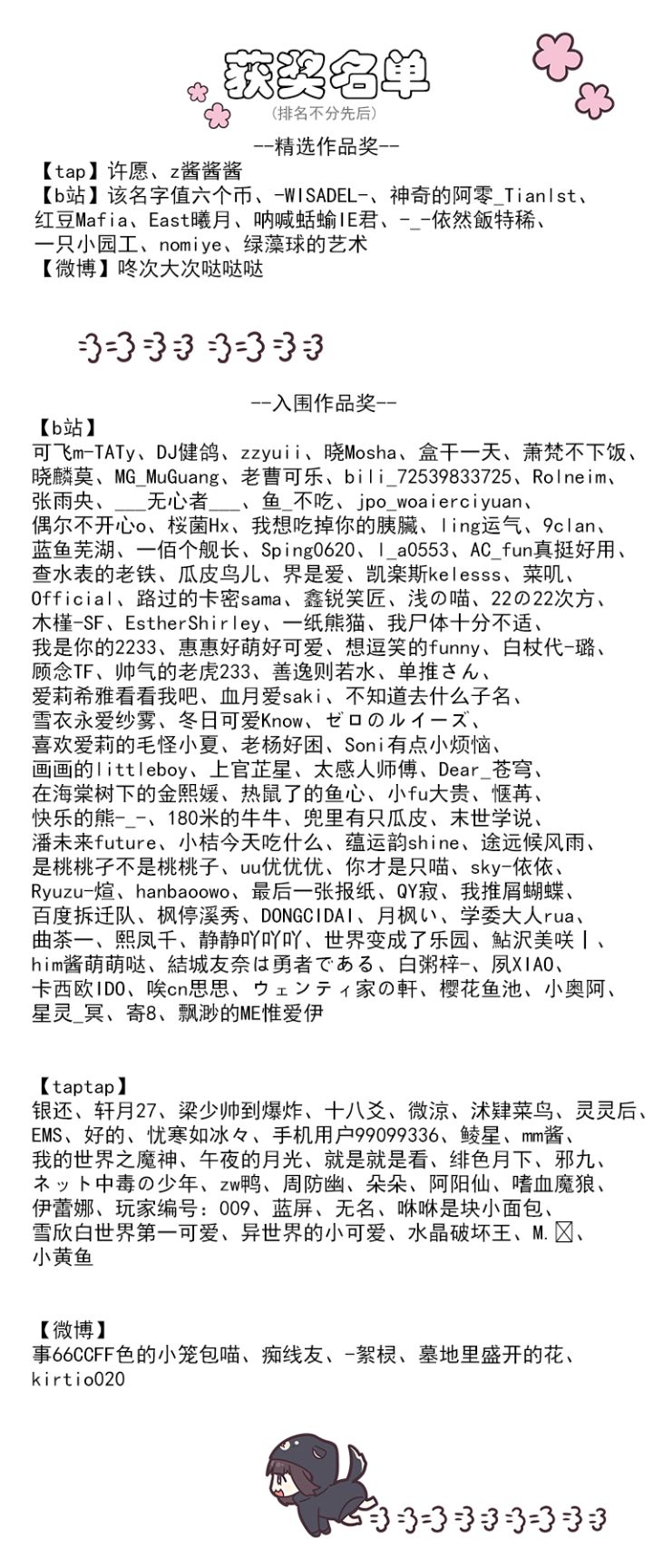 #开学季 #这十几天里 ,胡桃跟着大家去看了很多学校,吃了很多好吃的,见证了你们的开心,也感受到了你们的压力。投稿太多,所以经过商量决定增加奖励的获奖人数。小部分作品由于看不出学校元素所以很遗憾落选。另外,重复的作品就不重复计算了噢~以上是长长的获奖名单,taptap的玩家请带tap昵称+QQ3583804758领取兑换码,使用兑换码在游戏内兑换成就奖励~