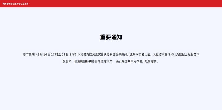 实在抱歉,目前由于秘钥到期,游戏的实名认证受到影响。不过因为中宣部的网站在春节期间不提供服务,所以还需要等待两天。昨天收到提醒消息,说是还有15天到期,就没在意,而且网站上说给20天的延期。好像都没生效。只能再等两天了,实在是很抱歉。