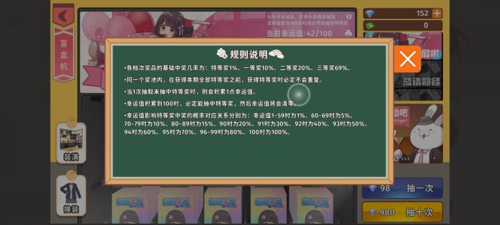 1:出金的概率我个人感觉其实只要不是特别非酋基本70抽左右的10连大部都能出而且这概率是根据你抽的次数越多越容易出。2:个人看法:其实像胡桃日记这类养成游戏真没必要追求什么金,我自己微氪两左右,出的金色衣服穿的也很少,我的审美其实我更喜欢这件白色的JK。至于我为啥氪金也只单纯的想要那个小狐狸披风因为那个挺戳我审美的。3:微氪建议建议抽每日福袋,但不是现在福袋的紫色品质的衣大多可以抽出来,等