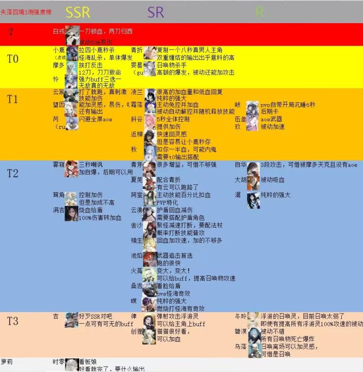 就上测所知,白戎,摩多,小鹿,婴晷,斜谷,返柳,秋,芮,一个奶妈(凌兰或者霜落)即为最强阵容。其中,斜谷这测可以替换茸角,雾窥。望因可以作为返柳和法术输出下位替代。----------------4月19日更新------------调整:时零我给了很高的期望,可惜,只能T3。满吉现阶段很少会用攻速武器,跟常规配队不够适配下调一个等级,婴和凌兰,数值强大,上调。青折的复制体现在有用了,上调潺