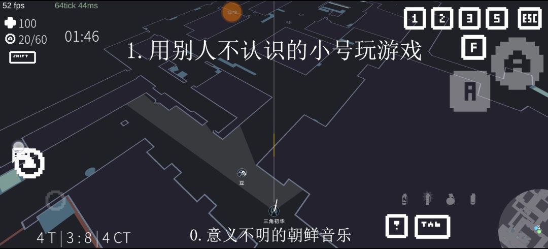 今天9.刚开服可能有些新人对键位用途不是很清楚 我先随便写一下键位的用途供新手参考用。 如果你进入对局发现没有该有的键 去设置里点击重置按键。 还是没有解决的话最后会有官方群号,请加群解决 群号我会放在最后。 分区块来看 左上是生命值和枪械剩余子弹数量 往下是道具栏 左下是两方各剩余人数(ct是蓝色剩余,t是黄色剩余) 移动方式目前只有摇杆操作 小地图看个人,不喜欢可以双击按住往下拖,可以缩没 比