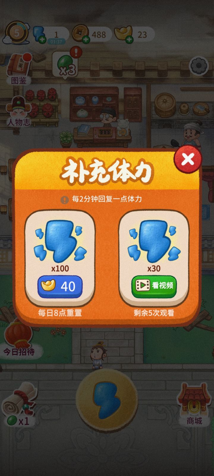 玩了几天,挺有意思的,之前玩过肥鹅,永远卡关卡的我不玩了,客栈还不错,完成了订单,会更新更多订单,有可玩性。我现在17级,40玉,澡堂解锁了,但是好像没有东西可以升级了,是我卡了,还是咋的,开开关关好几次,还是没有东西升级体力恢复还可以,两分钟一点,也可以看广告,或者用元宝换,也能开箱子合成体力我中间看了很多广告,哈哈哈总体来说休闲娱乐还不错