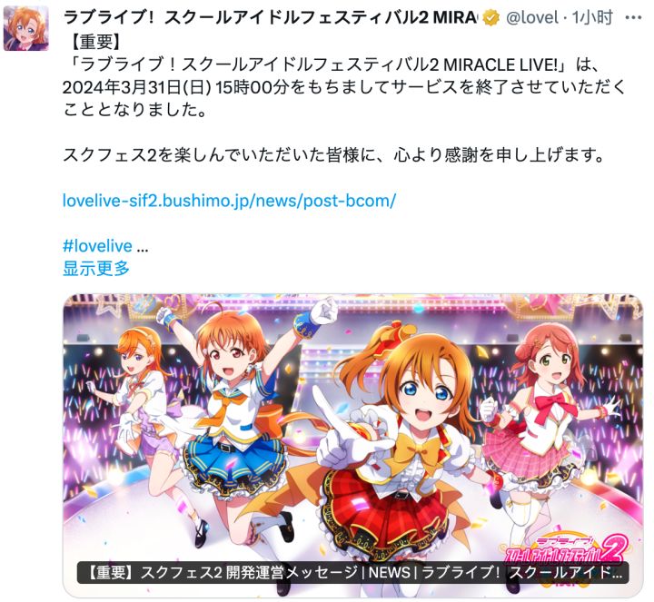 上线不到一年,《LoveLive! 学园偶像祭2》宣布3月31日关服