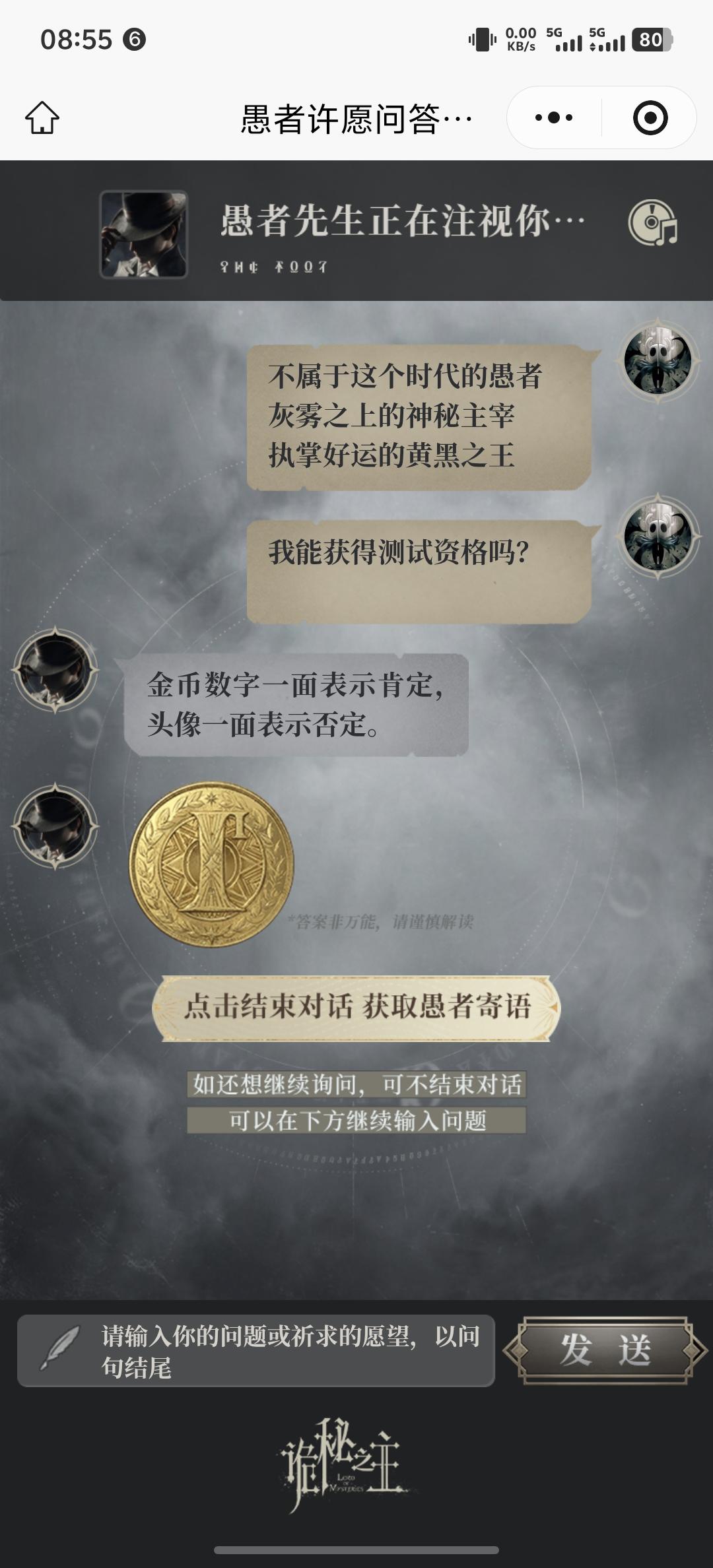 各位好,我是苏茜。你穿越了,重生在《诡秘之主》的世界里,这里是廷根市。 欢迎你,一位「愚」选之子你究竟从何而来?又将扮演着怎样的角色?这些你最急迫想要了解的问题,都将由我——苏茜,为你一一解答。你是否曾渴望,能向灰雾之上的神秘主宰亲自提问?现在,机会来了!一个和愚者先生1V1私聊的通道被隐秘力量开启。在此,你可以向他提出那个盘旋于心的疑问,一个能用是或否回答的问题。只需静待,为你揭示
