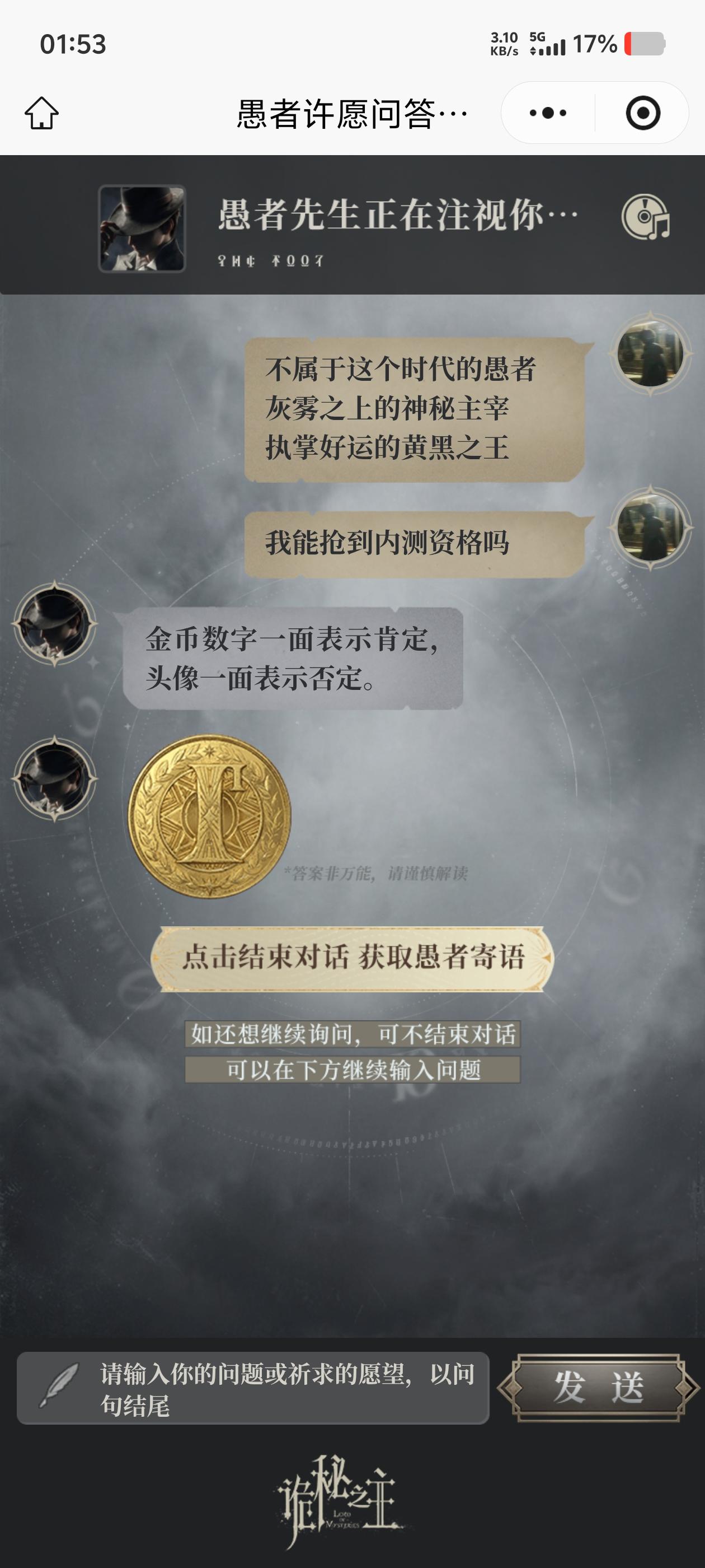 各位好,我是苏茜。你穿越了,重生在《诡秘之主》的世界里,这里是廷根市。 欢迎你,一位「愚」选之子你究竟从何而来?又将扮演着怎样的角色?这些你最急迫想要了解的问题,都将由我——苏茜,为你一一解答。你是否曾渴望,能向灰雾之上的神秘主宰亲自提问?现在,机会来了!一个和愚者先生1V1私聊的通道被隐秘力量开启。在此,你可以向他提出那个盘旋于心的疑问,一个能用是或否回答的问题。只需静待,为你揭示