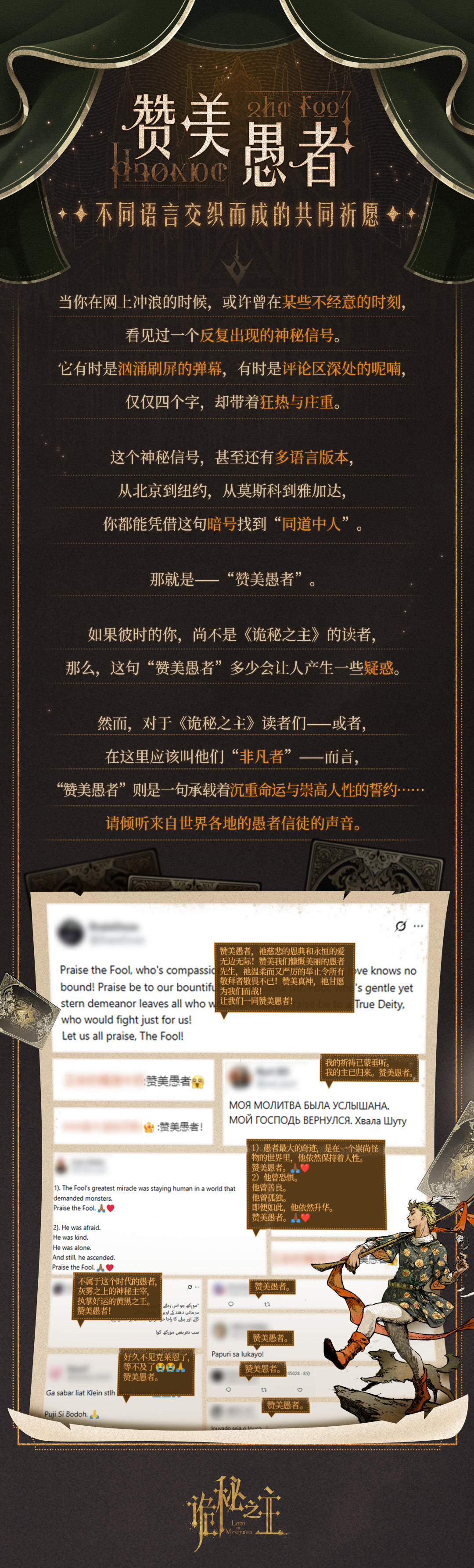当你在网上冲浪的时候,或许曾在某些不经意的时刻,看见过一个反复出现的神秘信号。它可能是不同的语言,可能来自各种地点。那就是——“赞美愚者”。如果你不是《诡秘之主》的读者,那么这句话,似乎多少有些让人感到疑惑。然而,对于《诡秘之主》读者们而言,则是一句承载着沉重命运与崇高人性的誓约,是共同的祈愿……