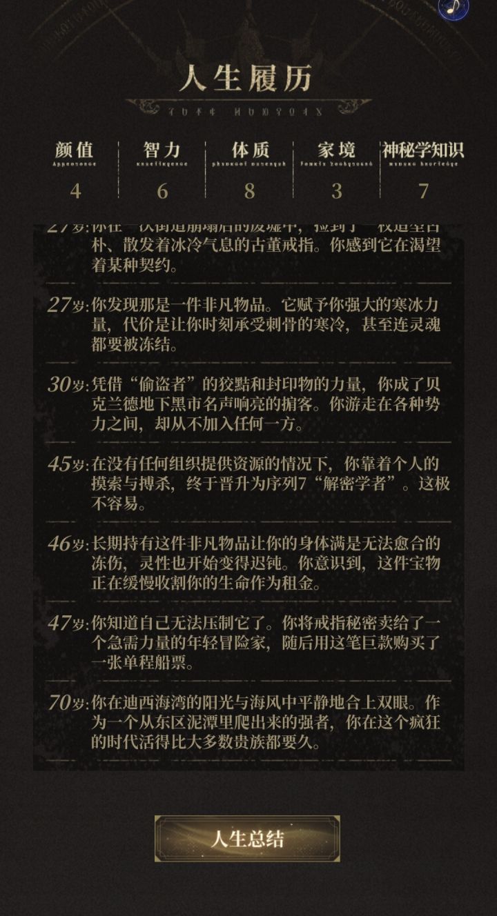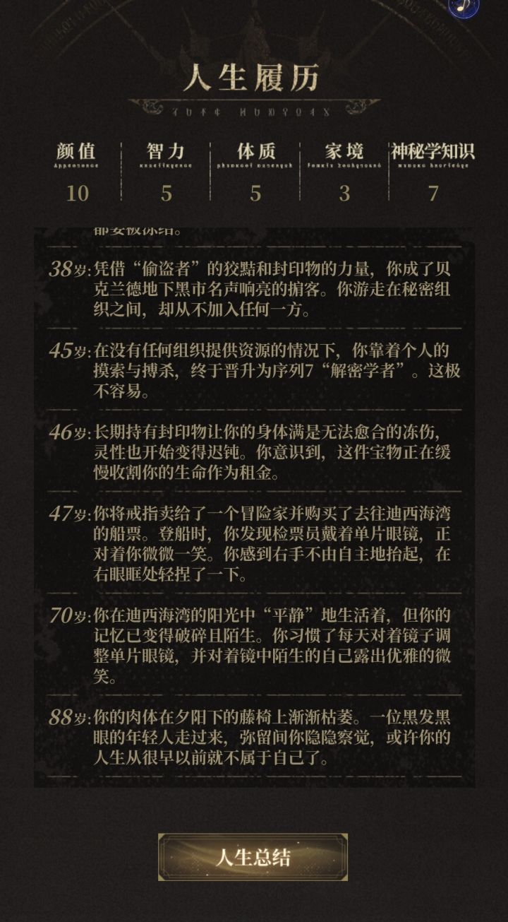你重生了。重生成了一位生活在廷根的非凡者。一位门途径——序列9——「学徒」。你是畅游世界的行者,是有形与无形之锁的克星。明日,你将用你的双脚丈量廷根,写下属于你的游记。请切记,不能逞强,不能骄傲,要懂得自身力量的渺小。非凡的一天即将开启。提前祝你玩得开心。