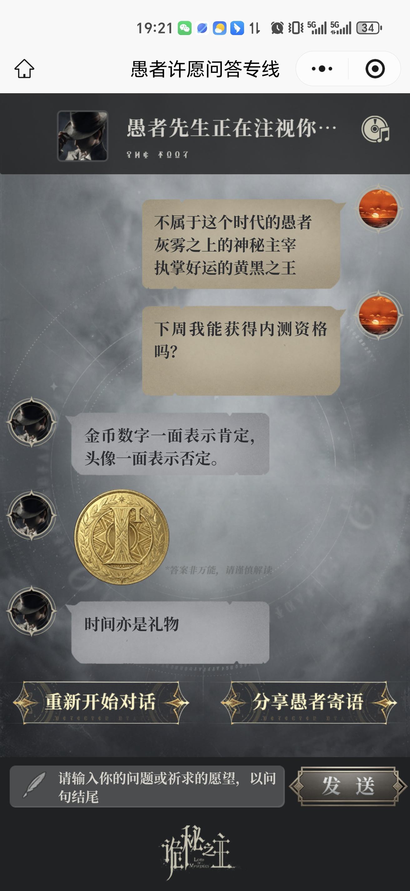 各位好,我是苏茜。你穿越了,重生在《诡秘之主》的世界里,这里是廷根市。 欢迎你,一位「愚」选之子你究竟从何而来?又将扮演着怎样的角色?这些你最急迫想要了解的问题,都将由我——苏茜,为你一一解答。你是否曾渴望,能向灰雾之上的神秘主宰亲自提问?现在,机会来了!一个和愚者先生1V1私聊的通道被隐秘力量开启。在此,你可以向他提出那个盘旋于心的疑问,一个能用是或否回答的问题。只需静待,为你揭示