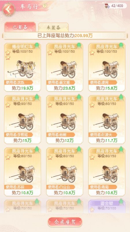 京都商界风云万变,在这过程中,车马行可以提供座驾协助掌柜!掌柜可为伙伴安排座驾,及时处理京都事务。车马行可安置座驾,掌柜可在车马行查看已装备座驾及未装备座驾,同时可由低星座驾合成高星座驾,掌柜需注意只有闲置中的座驾才可进行合成,已升级的座驾可免费重置。掌柜还可强化座驾和进行洗练,可提升配备该座驾伙伴的势力值,座驾强化到30级解锁洗练功能,洗练可直接提升座驾的百分比属性。橙色或以上品质的座驾达