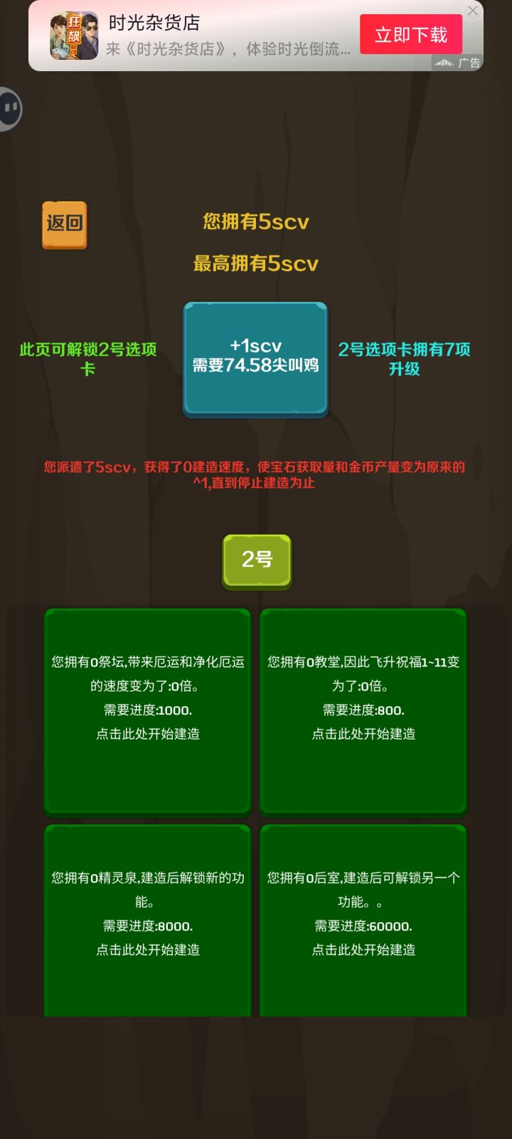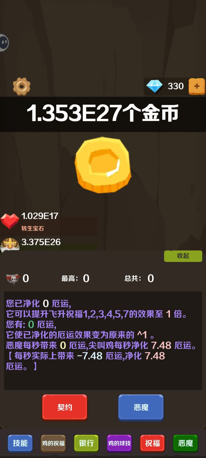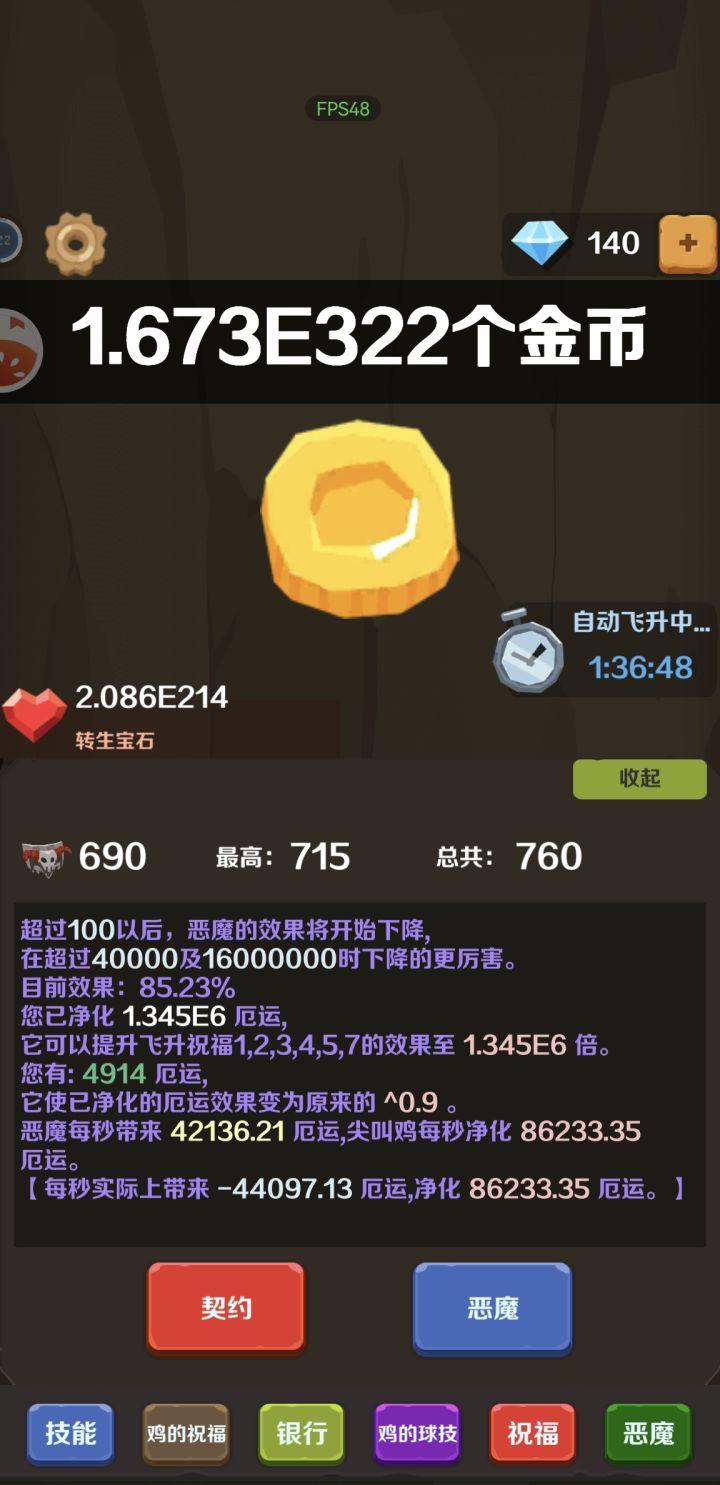 科技全解锁,不知道从什么时候开始,已经不用再手动升级科技了,算是翻版了。游戏不氪不看广告也可以玩给个好评,只是游戏内容重复度太高,而且玩到后面没有目标以后就没意思了。可以考虑修改一下银行和技能系统,金币只是用来升级银行没有意义,而且飞升即重置也很烦。科技单纯的两个科技树,飞升获得尖叫鸡,献祭获得恶魔增加厄运,尖叫鸡净化厄运的同时增加宝石获取效率。其实还可以融合一些元素进来,抽奖,塔防之类的应该会更有趣吧,浅谈个人观点,不喜勿喷