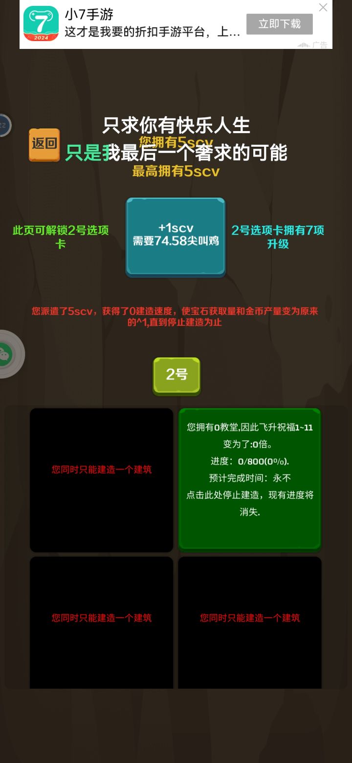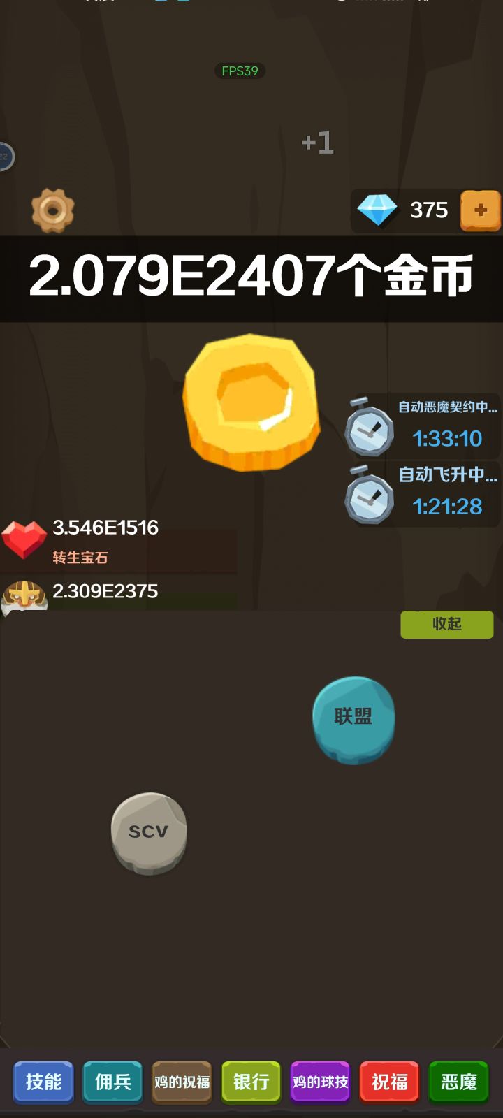 最新的这个版本(0.1.9)把游戏重做了。比之前更爽,更好玩。而且以后每周都会更新新的内容,大家可以小小的期待一下。0.1.9更新如下:1.点击和佣兵去掉升级了,技能也没有了。但是取而代之的是可以更快的飞升2.目前佣兵只有六个。3.游戏厅和道具功能被去掉4.飞升之后兑换宝石,宝石买祝福,祝福让你获得金币的能力超大幅增强,飞起。5.宝石达到15000后可以”觉醒“,觉醒兑换一只鸡,目前