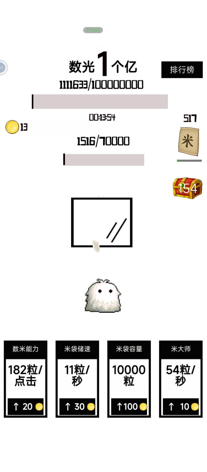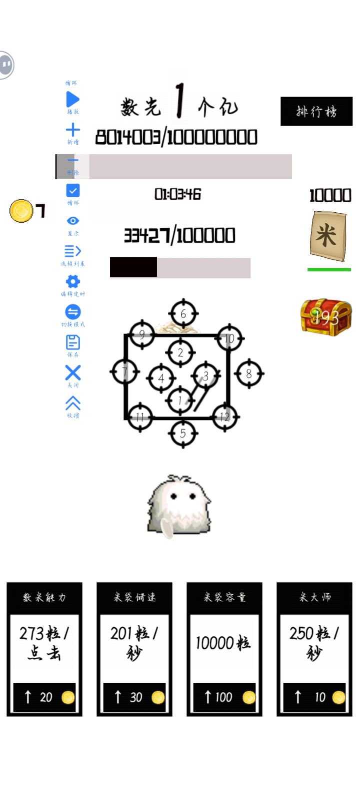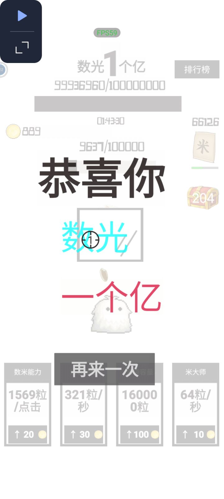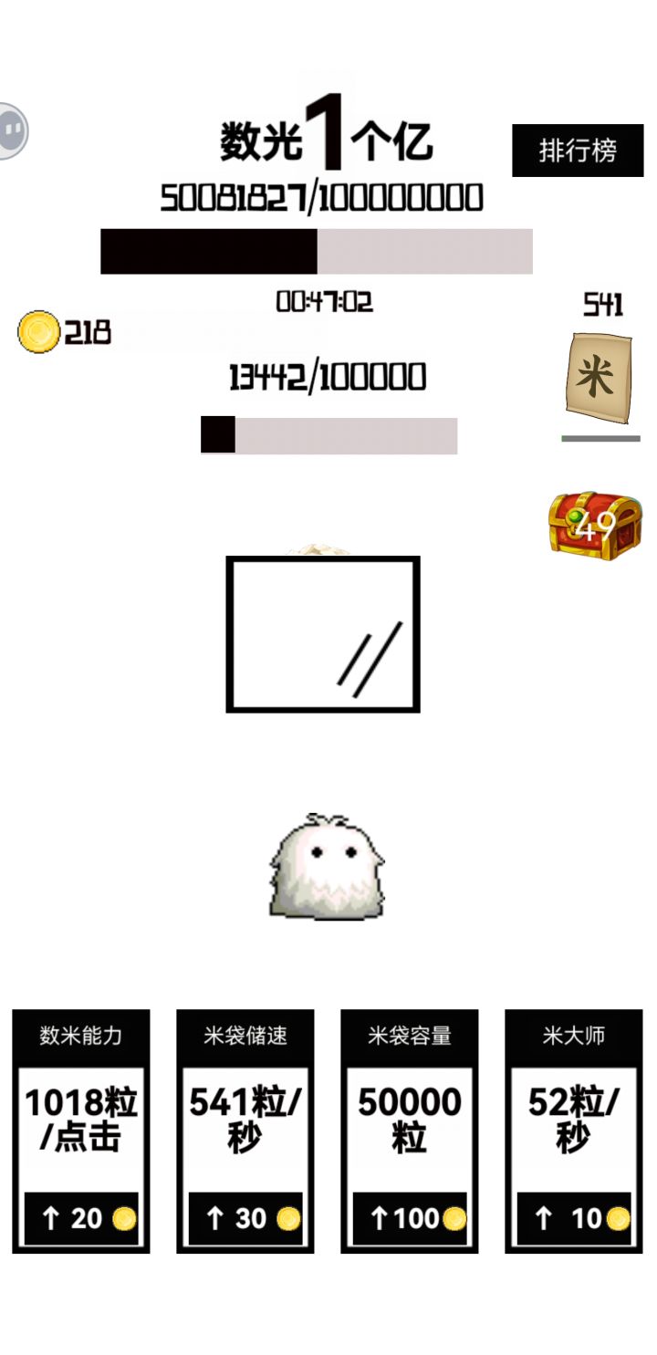 对应数量所需的时间,1小时能有多少。100万,10分钟内。500万,20分钟内。1000万,25分钟内。5000万,50分钟内。1亿,1小时05分内。一定要及时点箱子 ,其他的加成全都不用点,都是浪费金币的。把全部的金币都攒下来,加第1个手点增量。————本来可以一小时内的,中间上了个厕所,只能一根手指点时间是完全可以凹的,估计45分钟都可以。但是这玩意儿是属于不