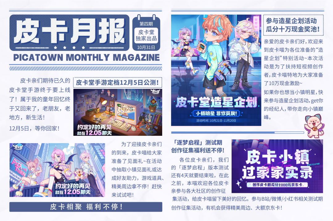 大事即将发生! 皮卡小镇的11月都发生了些什么呢? 就让本喵来为大家划重点吧! 本月份划重点工作达成![表情_开心] =皮卡月报= 距《皮卡堂之梦想起源》正式上线还有5天! 【预约福利加码】预约领限定服装、头像框等福利 寻回童年好友,还可领取限定徽章~ 快召唤你的童年好友 在皮卡小镇重拾快乐,一起打造精彩派对人生~ ⭐约定好的再见,就在12.05那天⭐ 《皮卡堂之梦想起源》12月5日正式上线! 皮