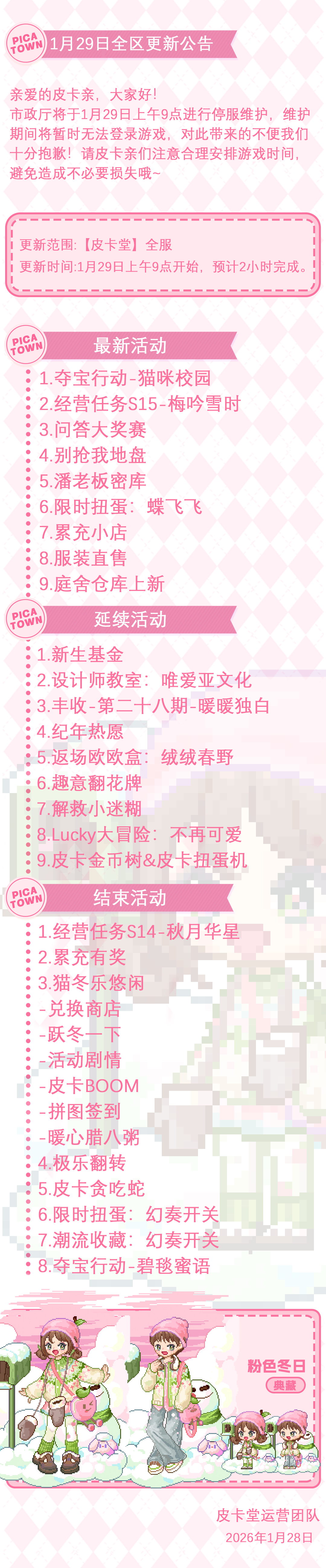 亲爱的皮卡亲,大家好!市政厅将于1月29日上午9点进行停服维护,维护期间将暂时无法登录游戏,对此带来的不便我们十分抱歉!请皮卡亲们注意合理安排游戏时间,避免造成不必要损失哦~【维护更新时间】1月29日上午9点开始,预计2小时完成。更新维护可能随着更新进度提前或延迟,如有突发事件造成延迟情况,我们会第一时间发布公告通知大家!如延迟开服,每小时补偿100金币。【维护更新补偿】【金币*100