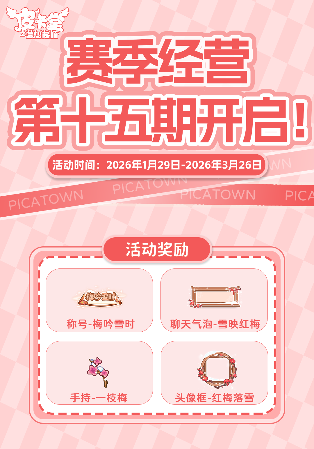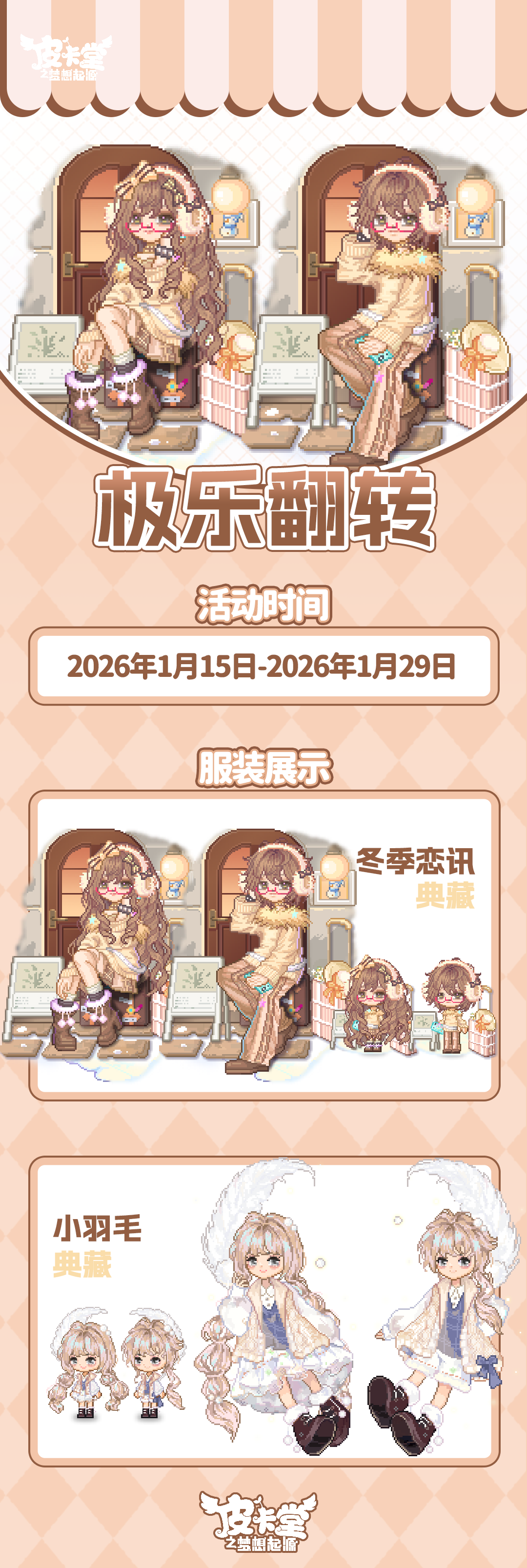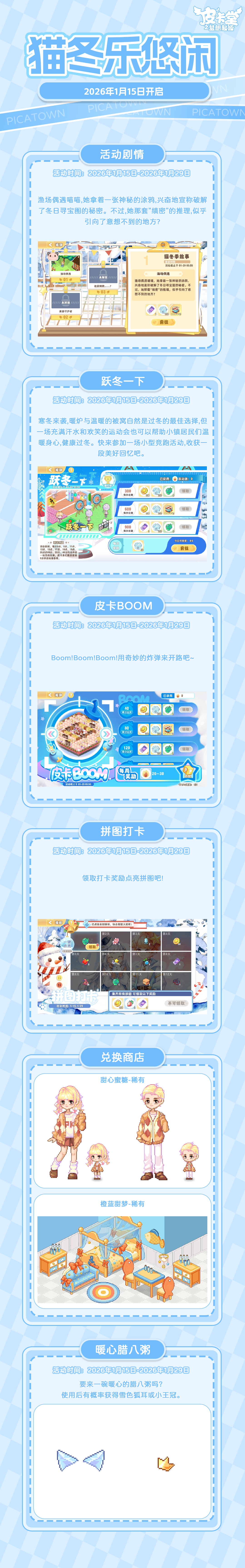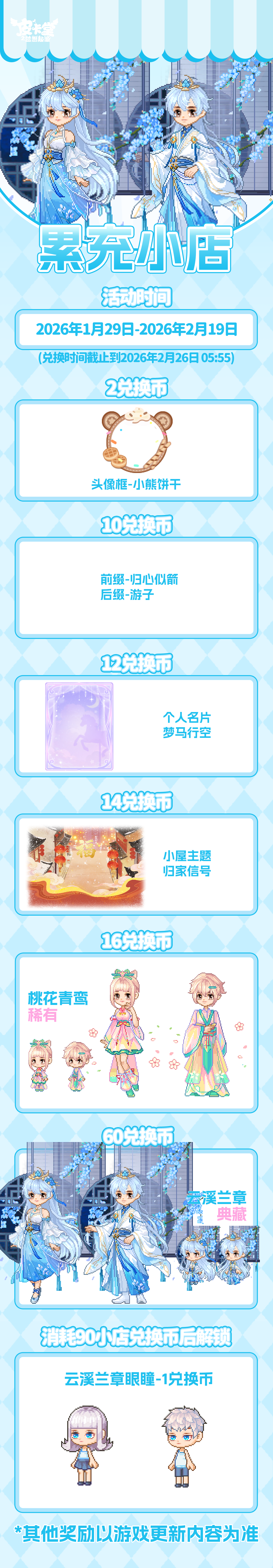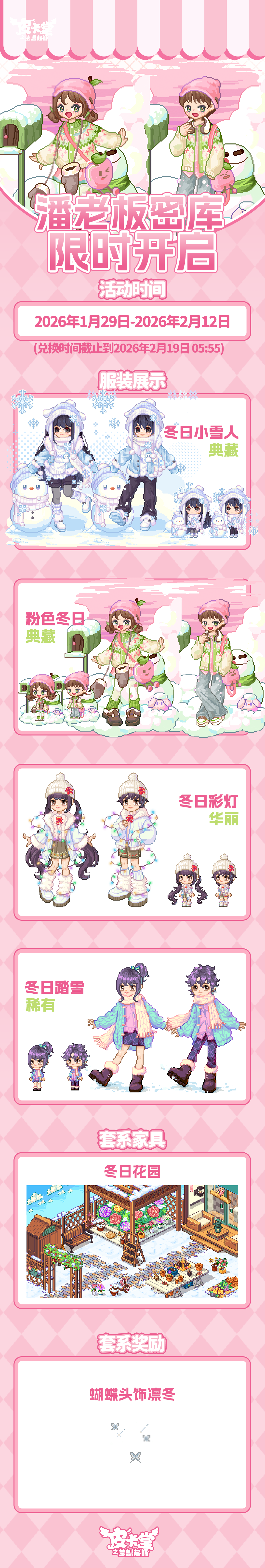 -【潘老板密库】上线!参与活动可获得典藏套装「冬日小雪人」、典藏套装「粉色冬日」、华丽套装「冬日彩灯」、稀有套装「冬日踏雪」以及「冬日花园」套系家具!-【累充小店】头像框「小熊饼干」、小屋主题「归家信号」、套系服装「云溪兰章」等奖励等你来拿!-【直售礼包】全新华丽套装「铃响青坪」上线、稀有套装「初冬校服」返场!-【限时金币扭蛋】返场!可使用限时扭蛋券/金币抽取,参与可获得典藏套装「蝶飞飞」、