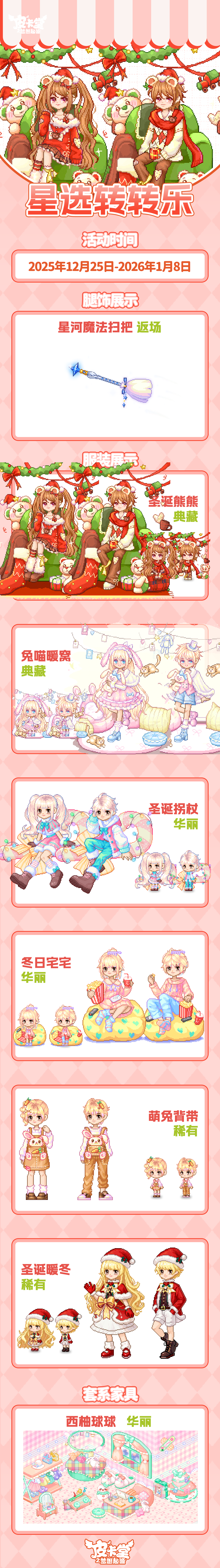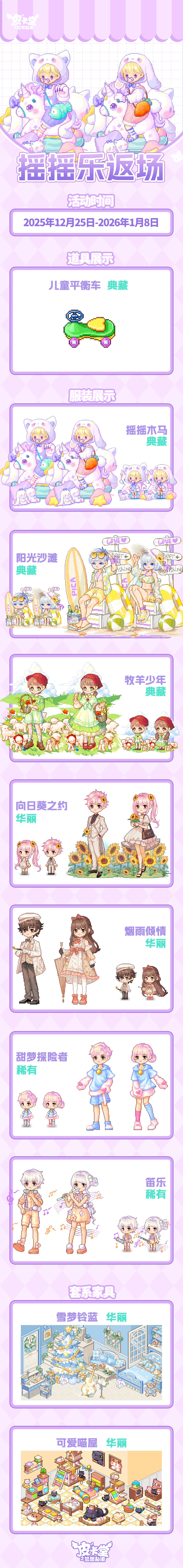 -【摇摇乐】 返场!参与可获得典藏套装「摇摇木马」、典藏套装「阳光沙滩」、典藏套装「牧羊少年」、 典藏道具「儿童平衡车」、华丽套装「向日葵之约」、华丽套装「烟雨倾情」、稀有套装「甜梦探险者」、稀有套装「笛乐」,套系家具「雪梦铃蓝」以及套系家具「可爱喵屋」!-【星选转转乐】“赐予我更多好看的装扮和家具吧!”星星听到愿望,于是带来更多选择~参与活动可获得典藏套装「圣诞熊熊」、典藏套装「兔喵暖窝」、华