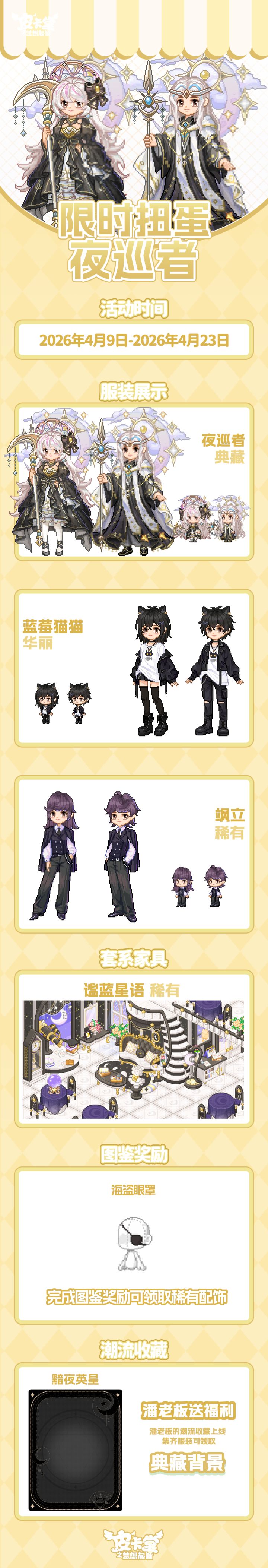 -【潘老板密库】上线!参与活动可获得典藏套装「织梦郁金香」、典藏套装「危机狂想」、华丽套装「饮咖一刻」、稀有套装「闪闪黑曜」以及「菜喵驿站」套系家具!-【累充小店】头像框「萌芽絮语」、小屋主题「喵趣丛生」、套系服装「踏春心情」等奖励等你来拿!-【直售礼包】全新稀有套装「绒绒兔兔」上线、华丽套装「暹罗喵」返场!-【限时金币扭蛋】返场!可使用限时扭蛋券/金币抽取,参与可获得典藏套装「月隐千面」、