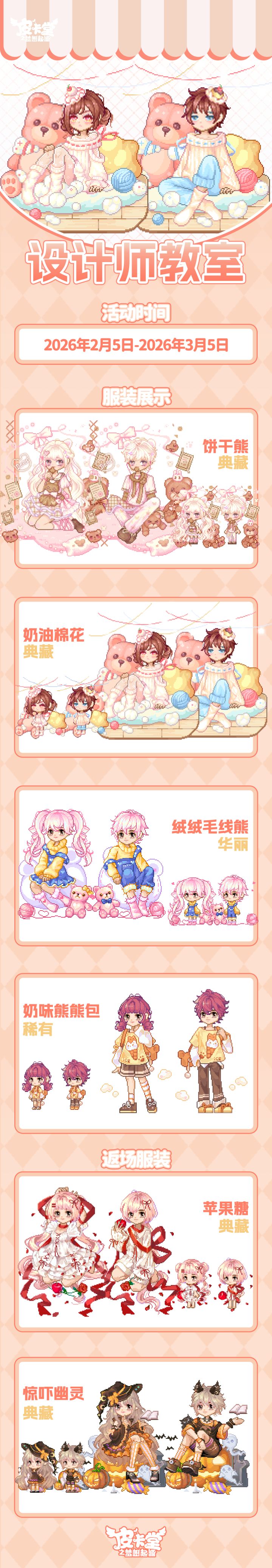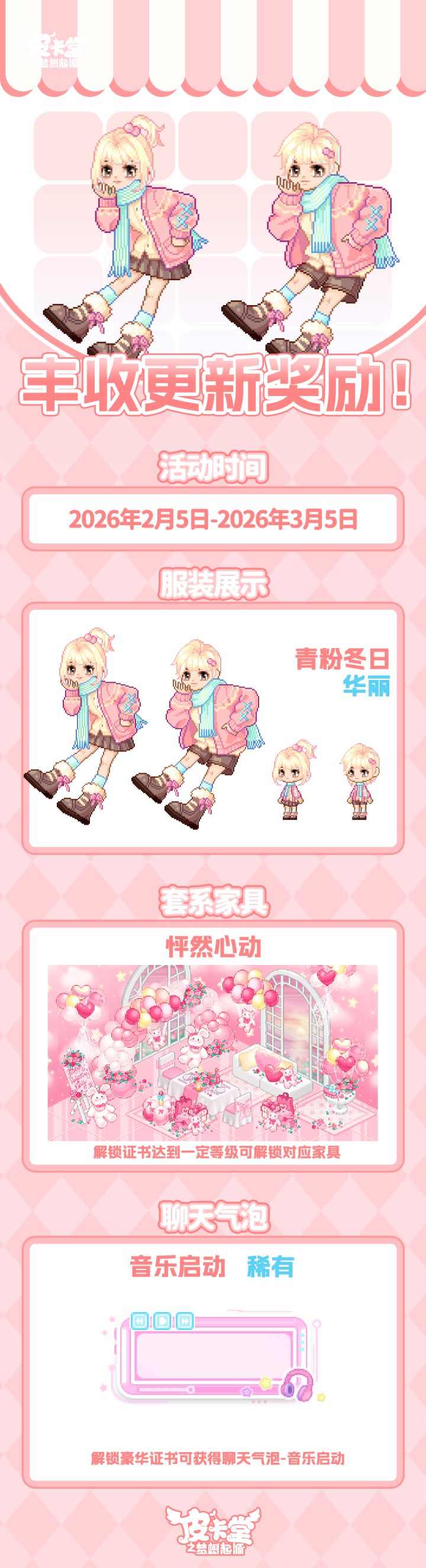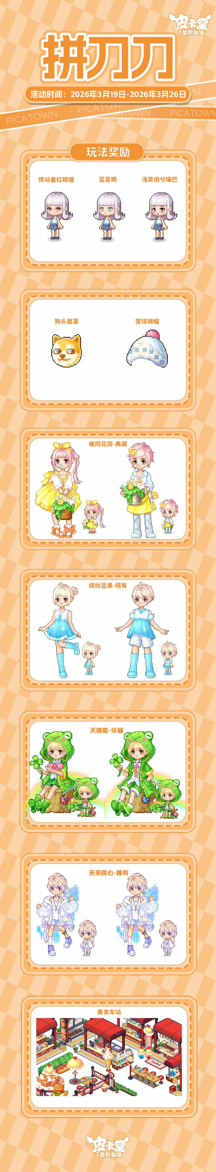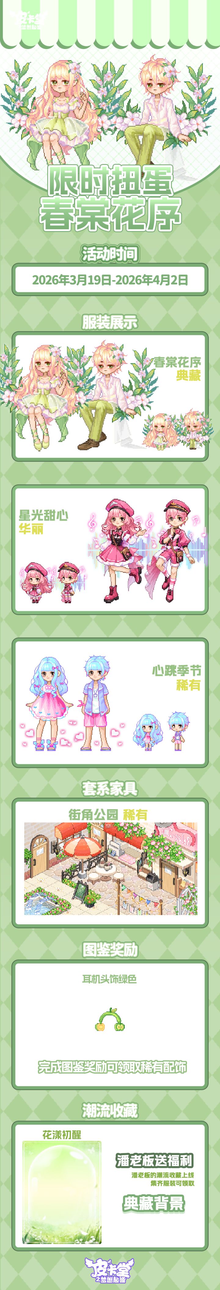 -【LUCKY大冒险】上新典藏套装「花花幼稚园」、稀有套装「童稚时光」,套系家具「稚园午间」!-【设计师教室】知名服装设计师阿拉克涅开设了设计师教室,皮卡亲们都可以找她学习制作装扮图纸,阿拉克涅还会给予勤奋的学员额外的奖励。-【丰收通行证】更新上线!购买通行证并完成对应任务可获得套系家具「宅野集」、华丽套装「海盐可可」,加购高级通行证可获得本期丰收活动限定聊天气泡「春分来信」!-【金冠兑换】