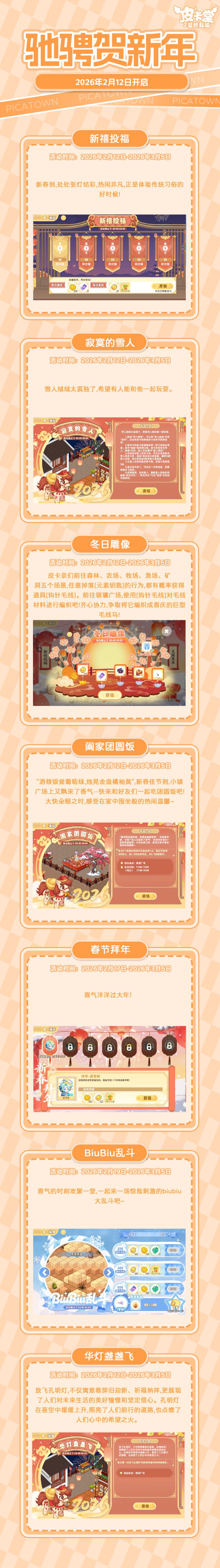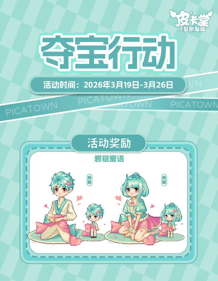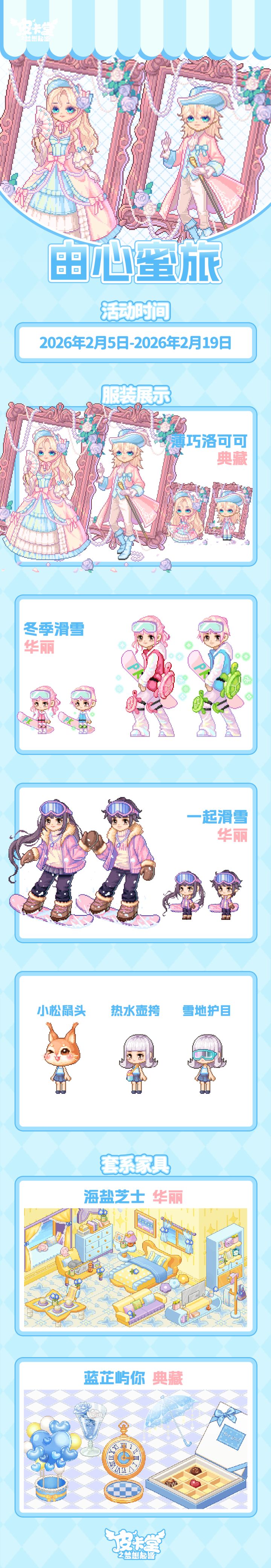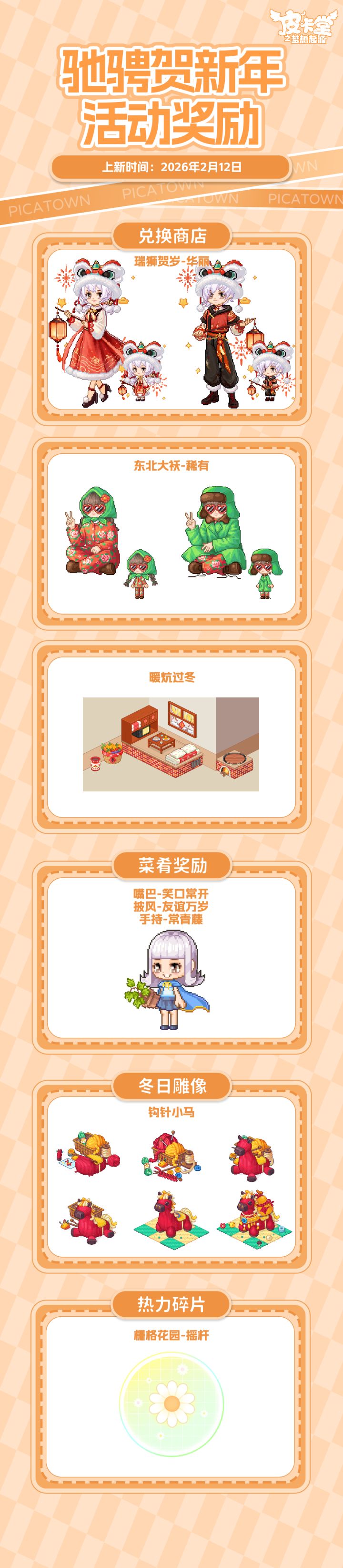 -【LUCKY大冒险】上新典藏套装「花花幼稚园」、稀有套装「童稚时光」,套系家具「稚园午间」!-【设计师教室】知名服装设计师阿拉克涅开设了设计师教室,皮卡亲们都可以找她学习制作装扮图纸,阿拉克涅还会给予勤奋的学员额外的奖励。-【丰收通行证】更新上线!购买通行证并完成对应任务可获得套系家具「宅野集」、华丽套装「海盐可可」,加购高级通行证可获得本期丰收活动限定聊天气泡「春分来信」!-【金冠兑换】