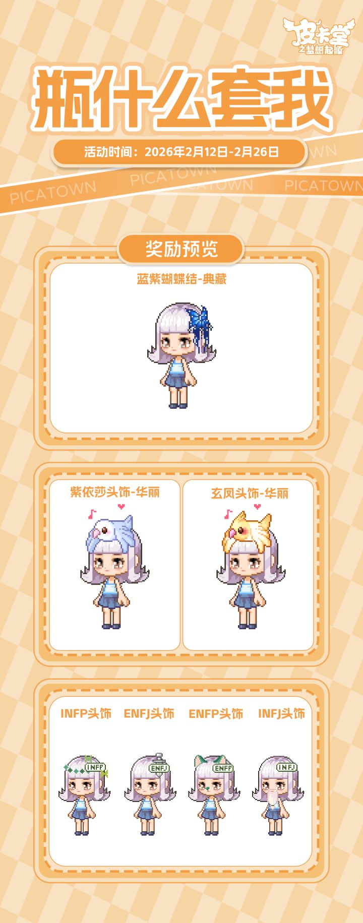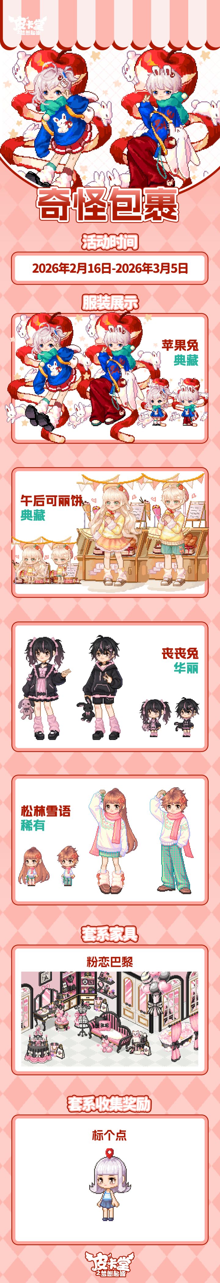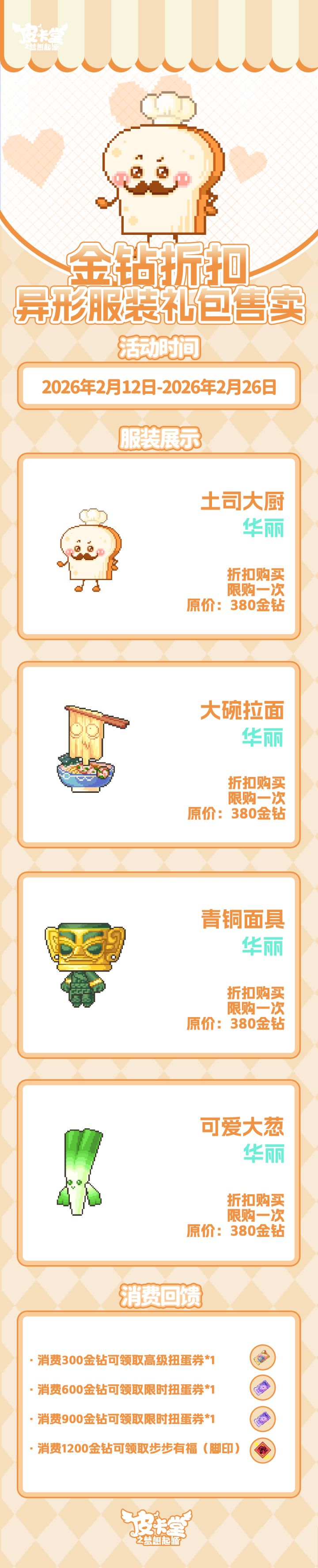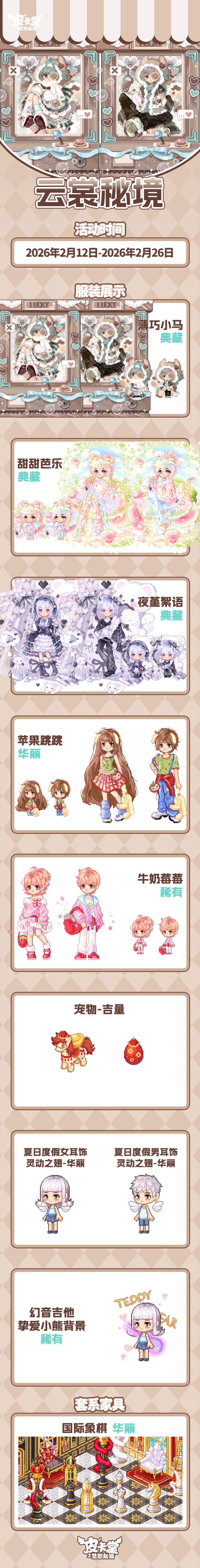 -【云裳秘境】云裳秘境隐于皮卡小镇星河之隅,是藏尽天地华裳、珍奇造物的幻梦之境,由云裳仙子执掌,唯缘者可入~-【折扣异装】返场啦!商城参与幸运折扣活动,可以优惠价格购入「大碗拉面」、「可爱大葱」、「青铜面具」异装,还有全新异装「土司大厨」! 商城内累计消费1200金钻可领取「步步有福」脚印!-【奇怪包裹】有一批奇怪的包裹悄悄来到了皮卡小镇,快来看看里面有什么吧!参与可获得典藏套装「苹果兔」、典