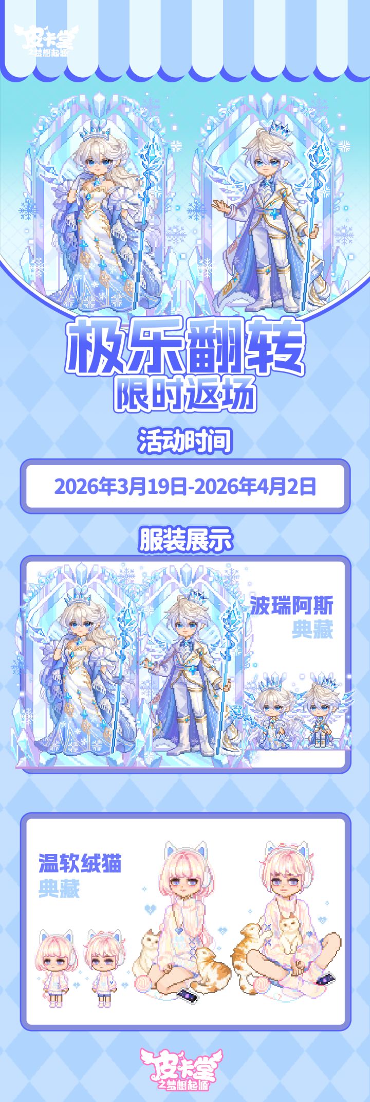 -【极乐翻转返场】弹指一挥间,天上地下,交给硬币来决定吧!小镇广场出现新机器,里面存着丰富的奖励,精美时装等你来拿,只需抛出一枚小小的硬币--参与活动可获得典藏套装「波瑞阿斯」、典藏套装「温软绒猫」!-【欧欧盒】星夜睡衣系列欧欧盒活动3月23日06:00限时返场啦!完成每日活跃活动可获得有点欧欧盒,开启【有点欧欧盒】必得2福星并有机会获得稀有服饰「鲜橙学院」(稀有服饰「彩虹格子睡衣」下架)、「