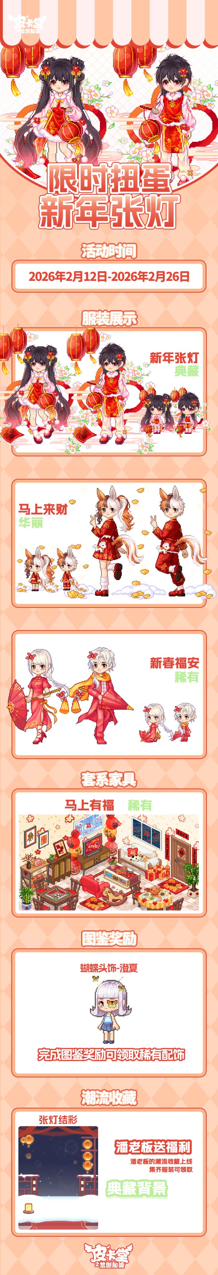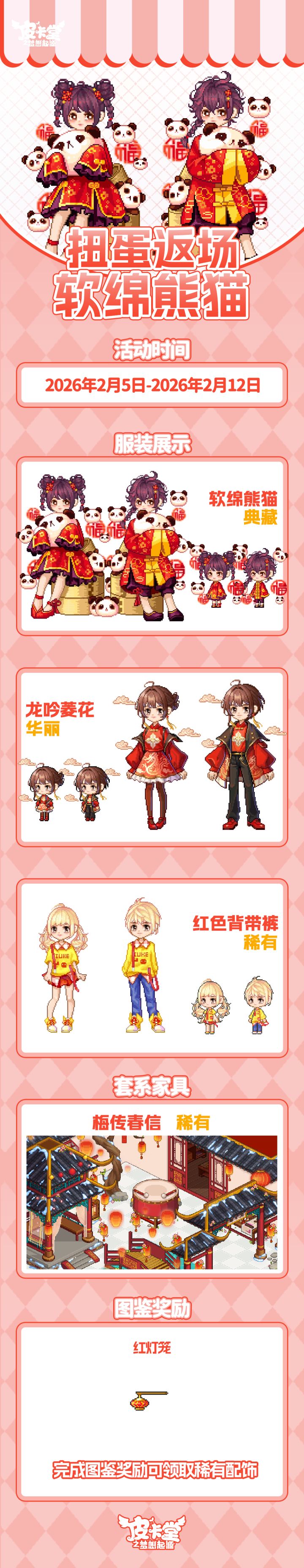 -【摇摇乐】 全新上线!参与可获得典藏套装「可可咪语」、典藏套装「恋恋主打歌」、典藏套装「向晚的星糖礼」、 典藏腿饰「风筝」、华丽套装「粉绒薰衣草兔」、华丽套装「兔蕾」、稀有套装「贝贝熊偶」、稀有套装「心暖棉冬」,套系家具「粉绒紫兔」!-【限时金币扭蛋】更新!参与可获得典藏套装「缤纷汤圆」、华丽套装「心笼蝶语」、稀有套装「灼华」,套系家具「灯宵同庆」!收集服装可获得名片背景「缤纷浮玉」!完成图鉴