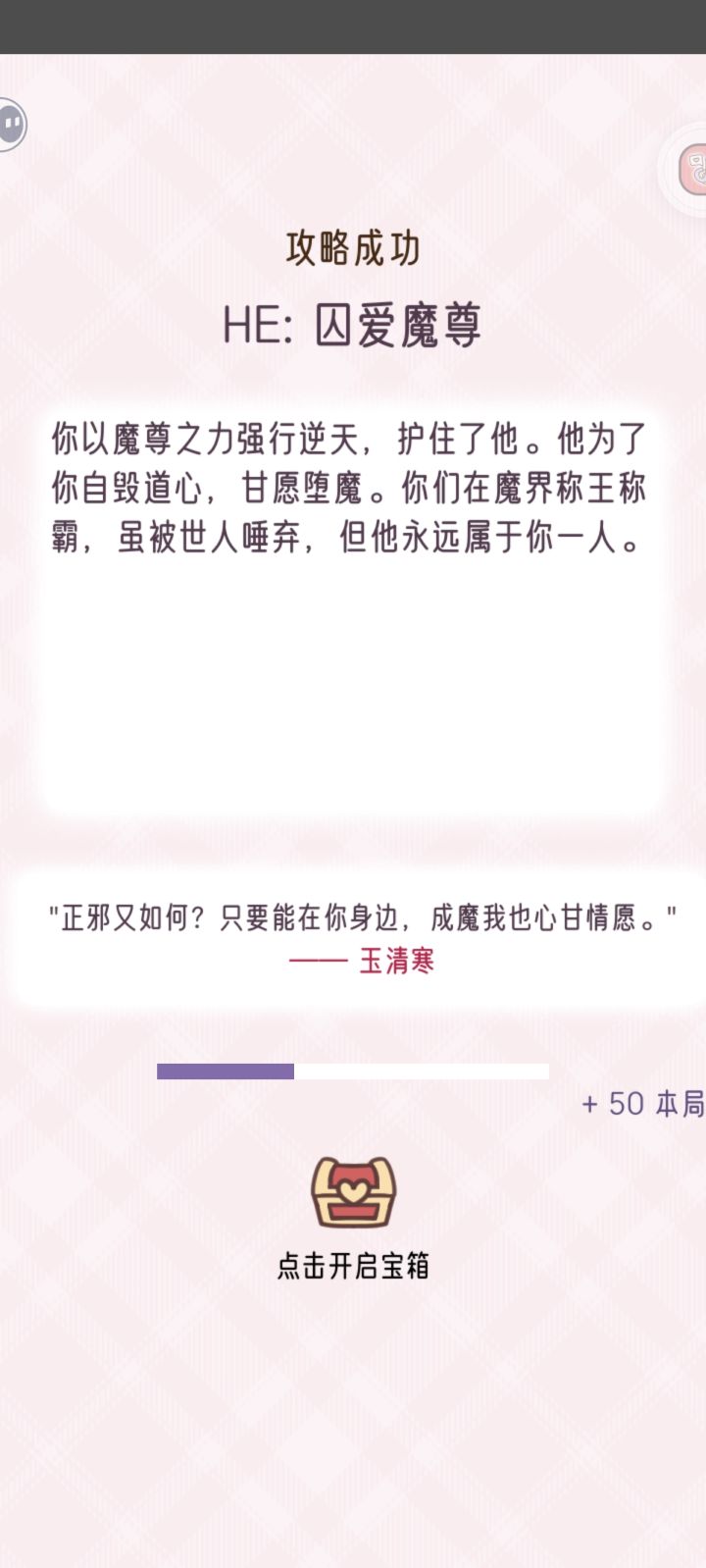 如果已经通关的世界可以做个成就界面,后面想回顾直接进去看就好了,要不然攻略成功也跟没有一样,很虚无啊。要是刷的话几个小时应该就能把四个世界he刷完吧,我也就玩了可能不到一个小时。如果多点世界剧情就好了,一个世界观的剧情虽然会有一些小细节变动,但总体大差不差,勉强算橙光代餐吧,毕竟橙光玩起来就没有这么休闲了 。