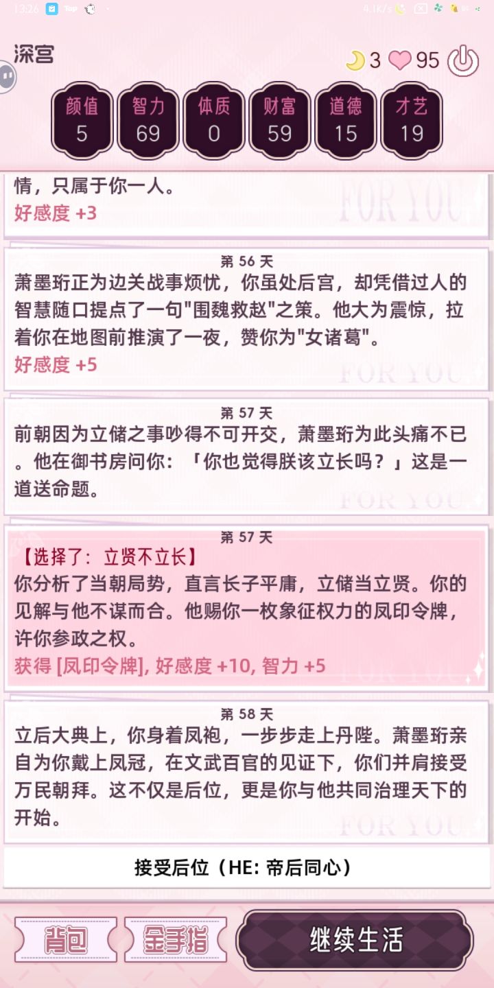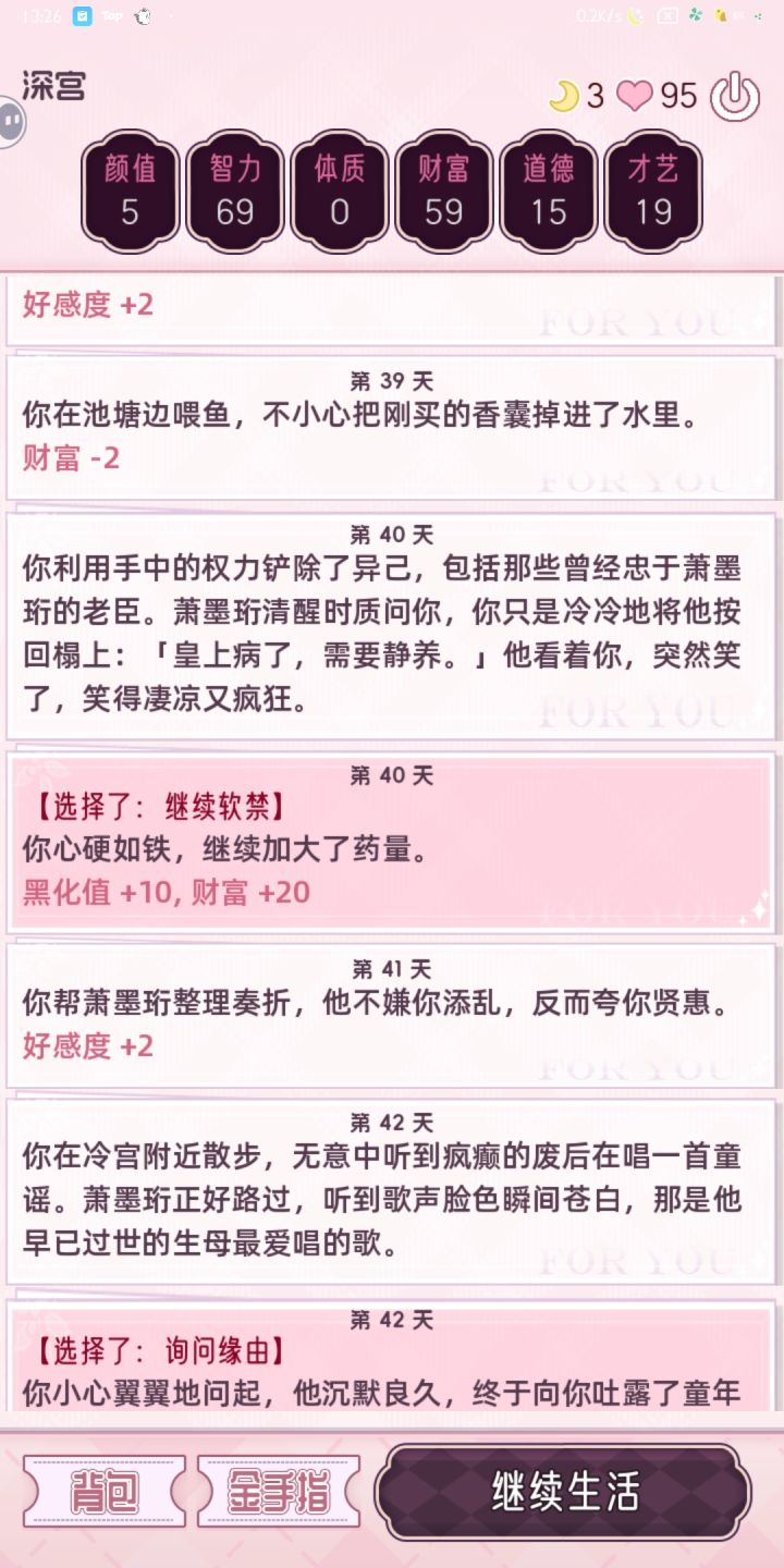 1.第1个就是黑化值和他的好感度要高2.第2个好感度高就行了多问他母后的事安慰他就行了3.第3个刷好感度 刷高了他自己会死4.第3个就是好感度不要太高 五六十就好了5.好感度刷到60 然后等结算就可以了