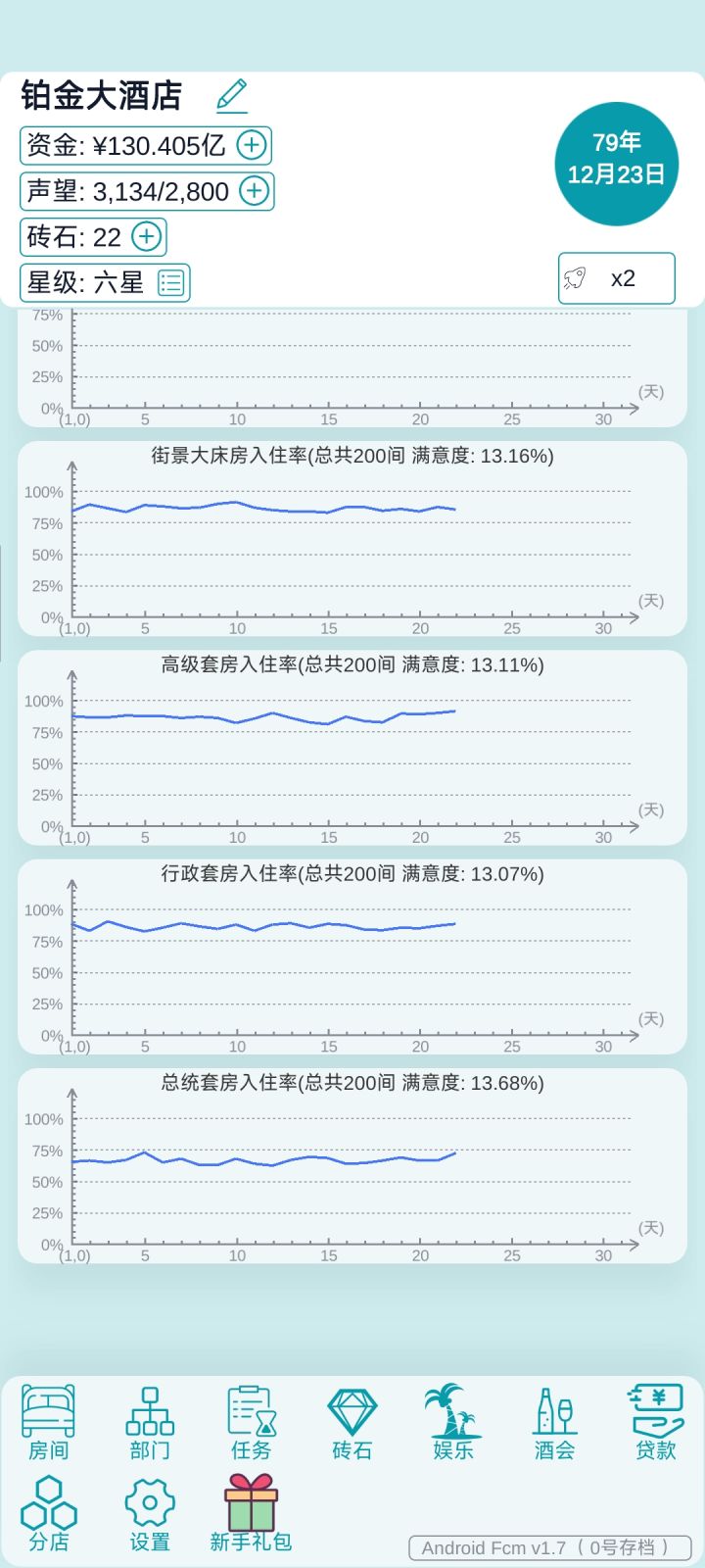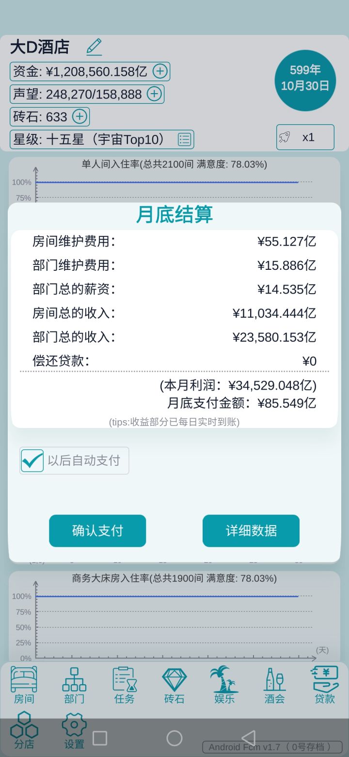这个游戏元素还不错,挂机、酒店、商务、建造、经营等元素。喜欢运营的朋友可以尝试,(但大概的运营元素就是贷款了)。说实话我玩的时候大概到八星以前都有种当老板的感觉,八星以后这个游戏的感官就会发生变化。说几点比较有用的:1.新手码:dalao666(这个应该是刚开始玩的时候最想知道的吧)2.几个时间节点:①每个月底是结算的时间,没钱就会破产(前期千