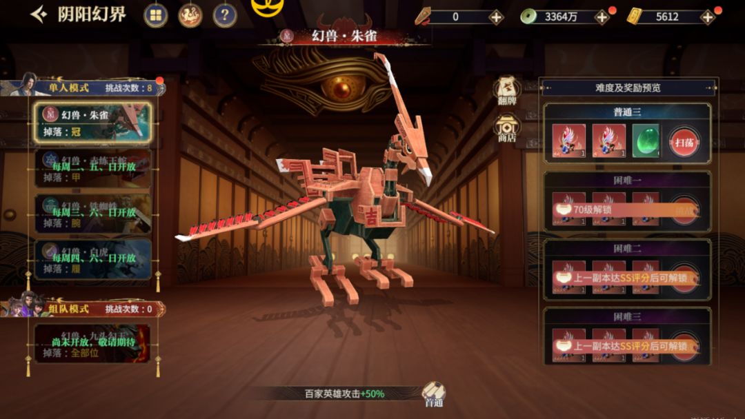 阴阳幻界-攻略篇 界面展示 玩法规则 幻兽“赤练王蛇”每周二、五、日开启 幻兽“铁蜘蛛”每周三、六、日开启 幻兽“白虎”每周四、六、日开启 每种幻兽产出装备部位不同,所以要合理安排时间攻略这个玩法哦 额外获取次可以靠VIP等级来增加 开启条件是受人物主角等级和当前难度评分等级控制的 玩法产出 普通产出,橙装和红1星-2星级别装备、装备强化材料、幻玉髓 困难产出,