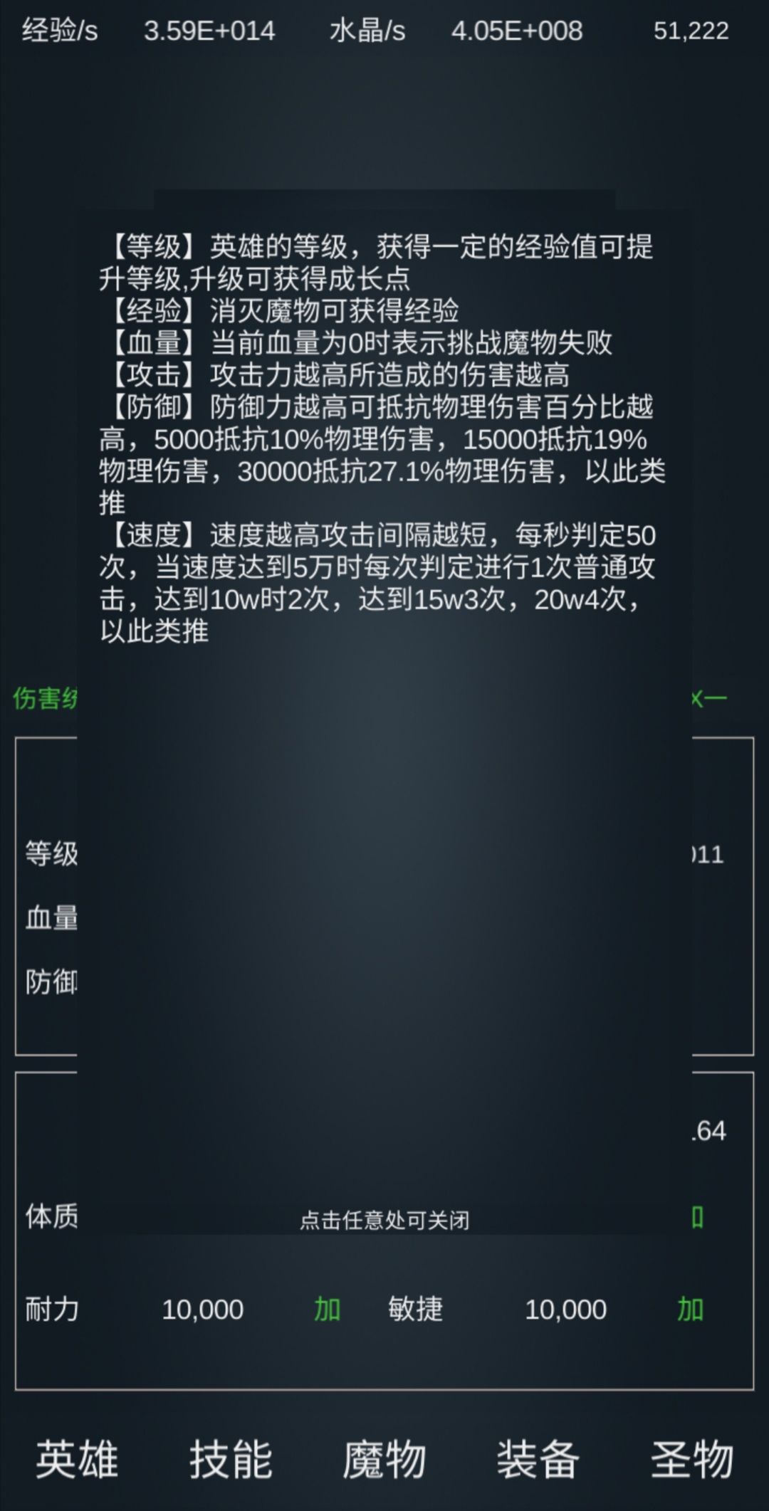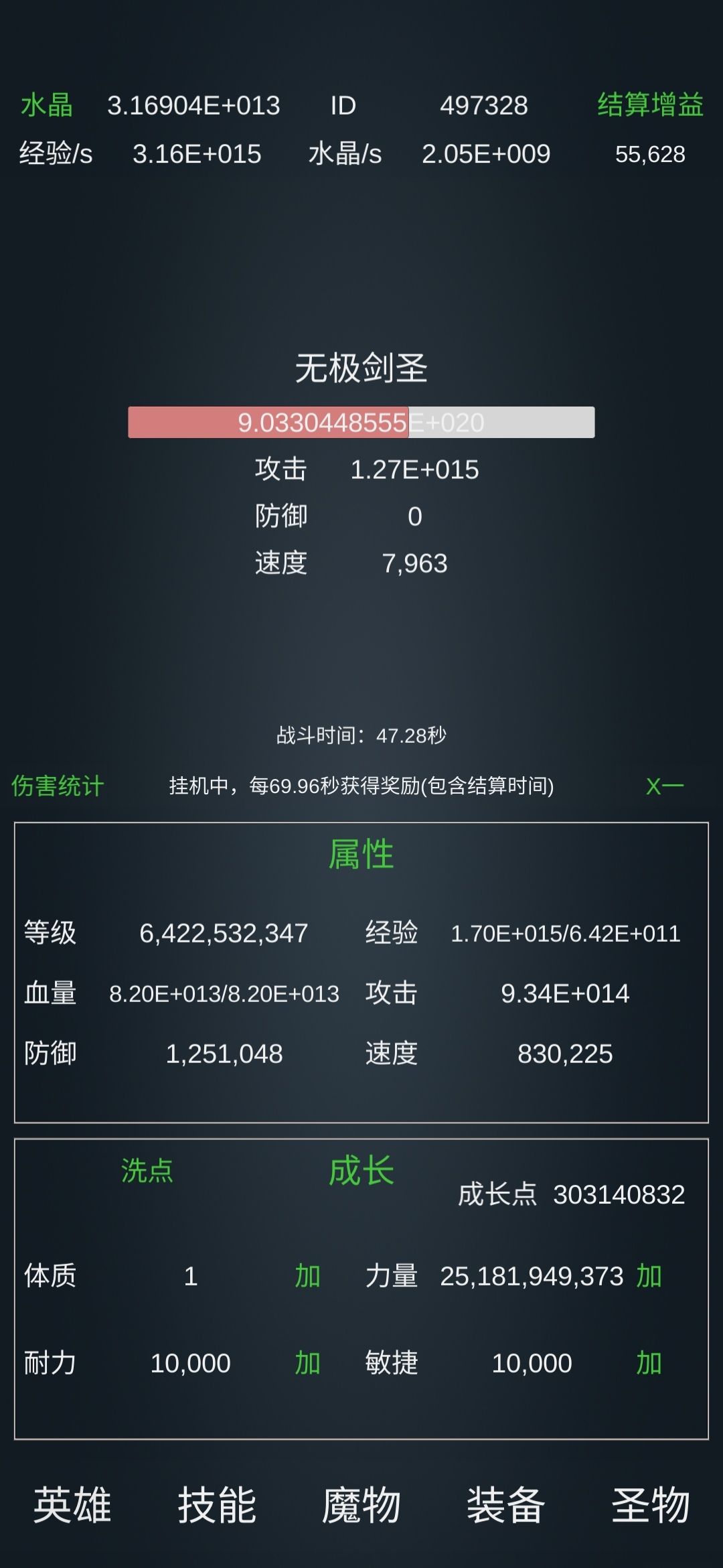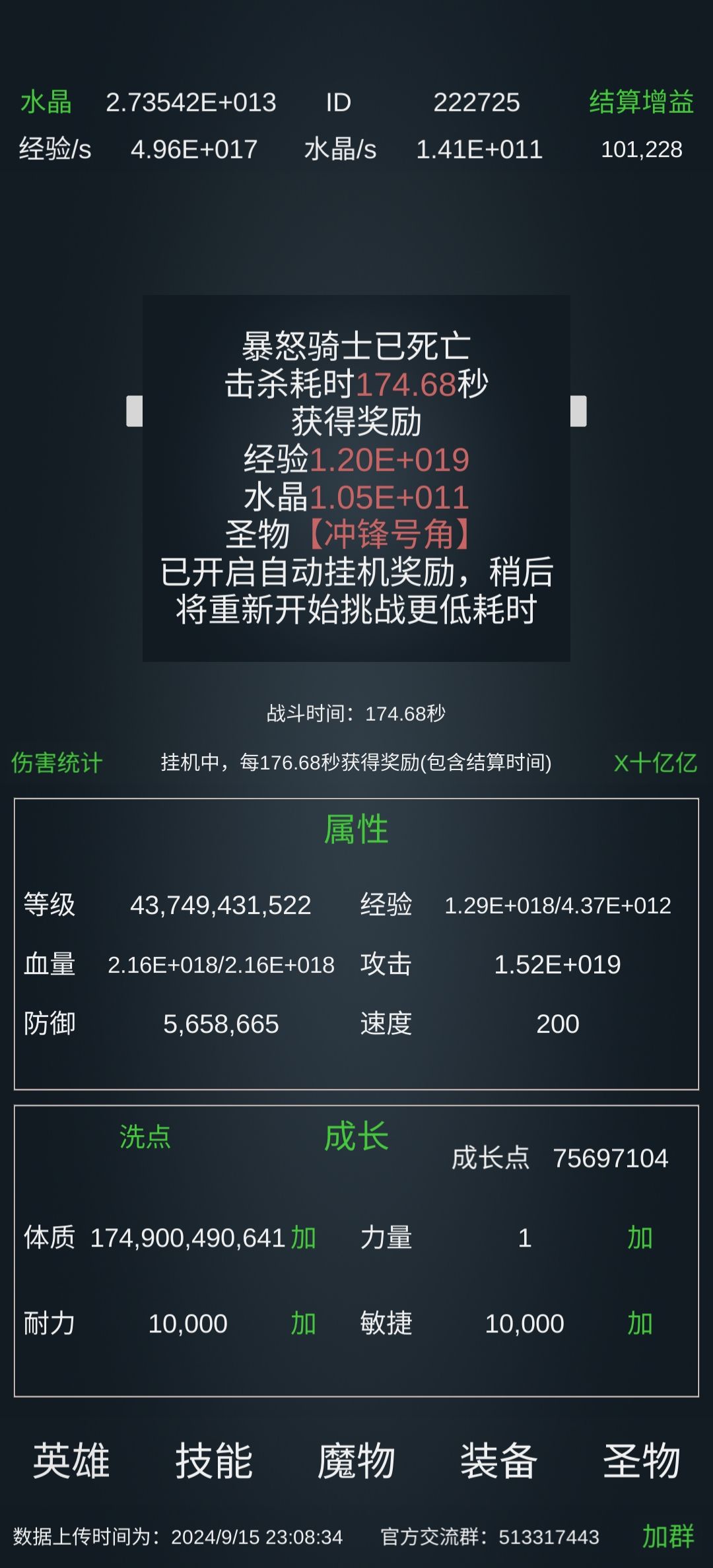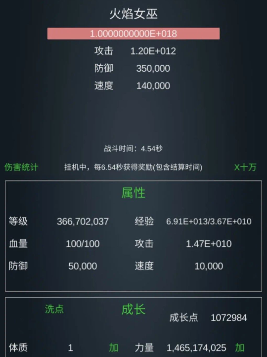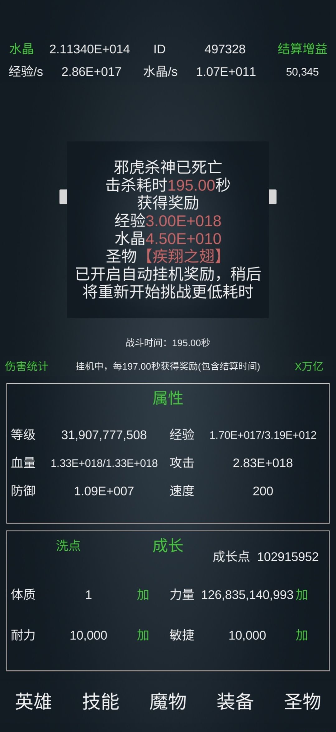 写上图 进场属性要达到这个血量2+20 攻击1.5+15 技能属性及思路 这个怪他的攻击范围超过血量的1%就会回血,所以你的攻击力只有在加25这个阶段能打动。所以你不能开任何技能,要关掉所有技能,关掉所有加攻击的圣物,只能用普通攻击打。 基础这里力量,敏捷,耐力百万亿 后冰封百万亿魔能转换10万亿三圣百万亿圣区2700万亿 圣物这里,凤凰满 乌龟壳满 血石满 魂满 青鸟至少20万 白虎至少十万