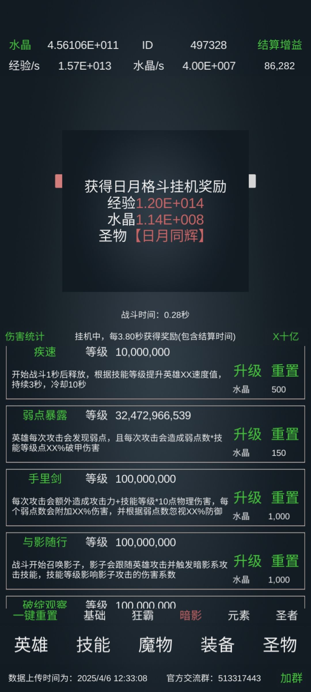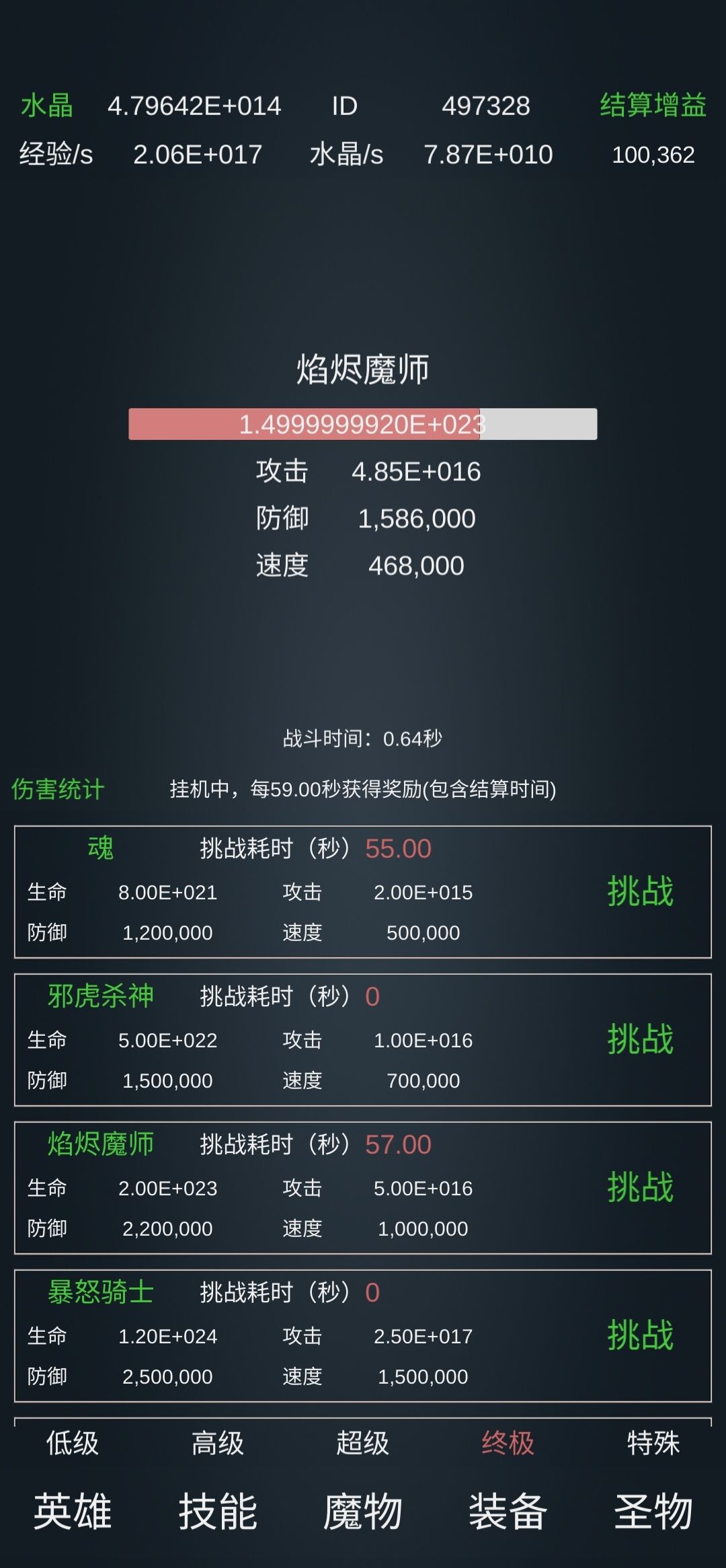 魔龙 技能: 基础:1千万亿级力训,百万级耐训。 霸者:霸体百万亿、霸盾10万亿、招架百万亿。 暗影:观察百万亿、迷踪十万亿。 元素:无。 圣者:圣罚千万亿,圣光千万亿,圣躯2.1亿亿,圣锁千万亿,治疗10万亿,碎甲10万亿,神力10万亿。 装备:开局1545附灵,当防御涨到5、6千万以上后,就可以开满附灵了,这个操作基本能在2千秒内通关。 圣物:(圣物没说就是不高,没标注等级就是满级) 低