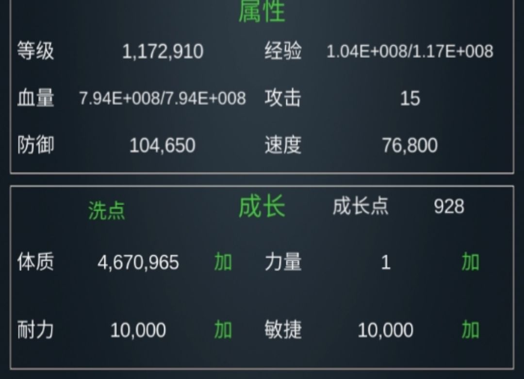 无敌,凤凰,玄武,复活,幽灵🈵,20万凝液。 8万亿力量训练,其他加点同攻略。