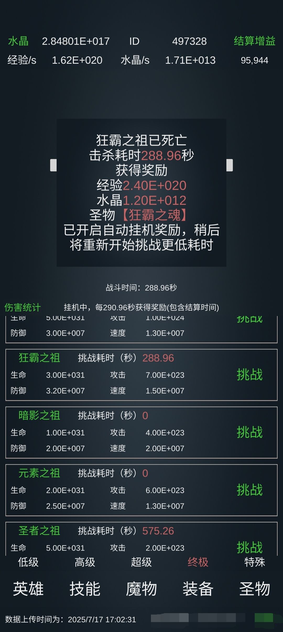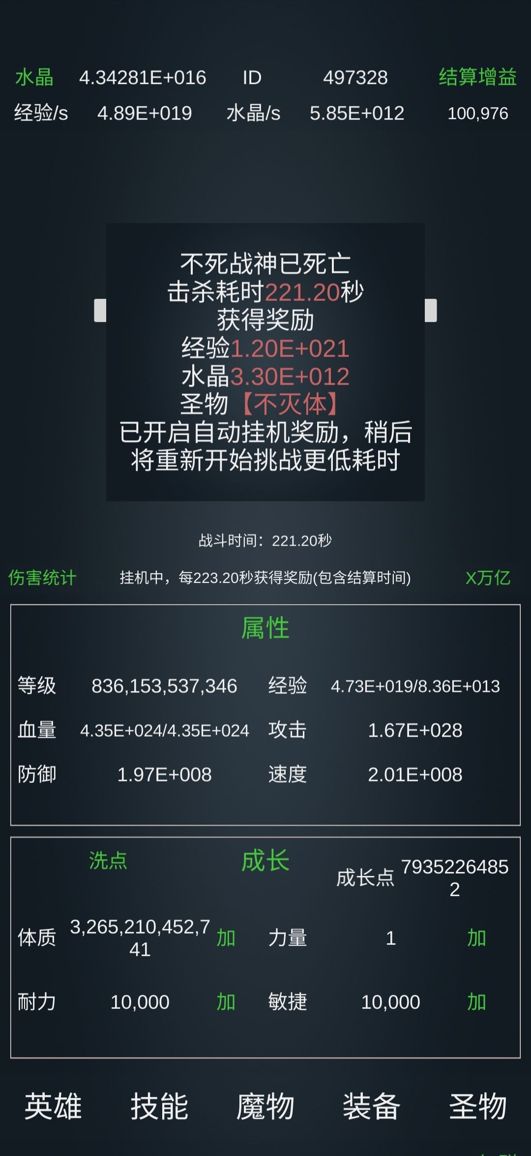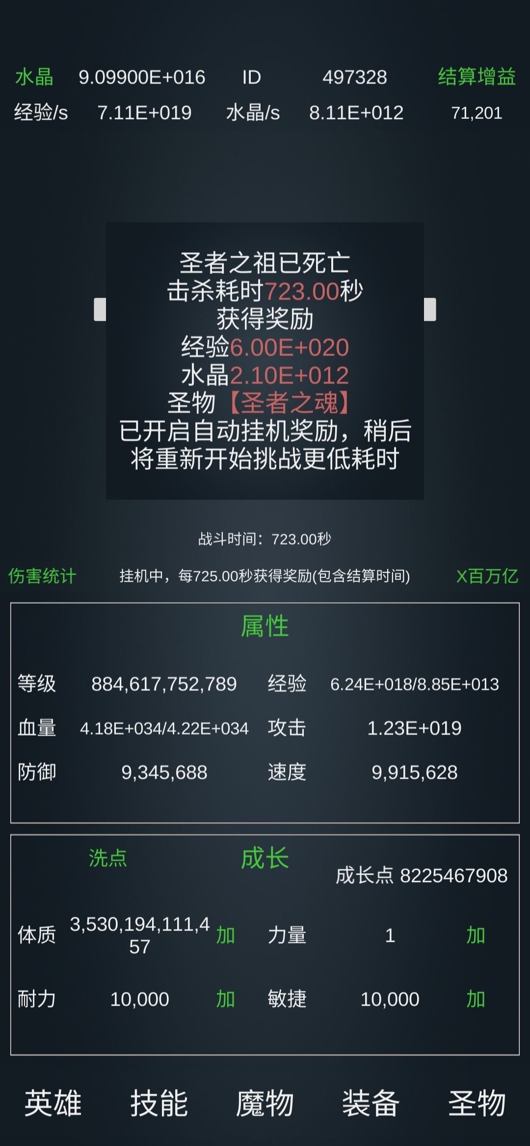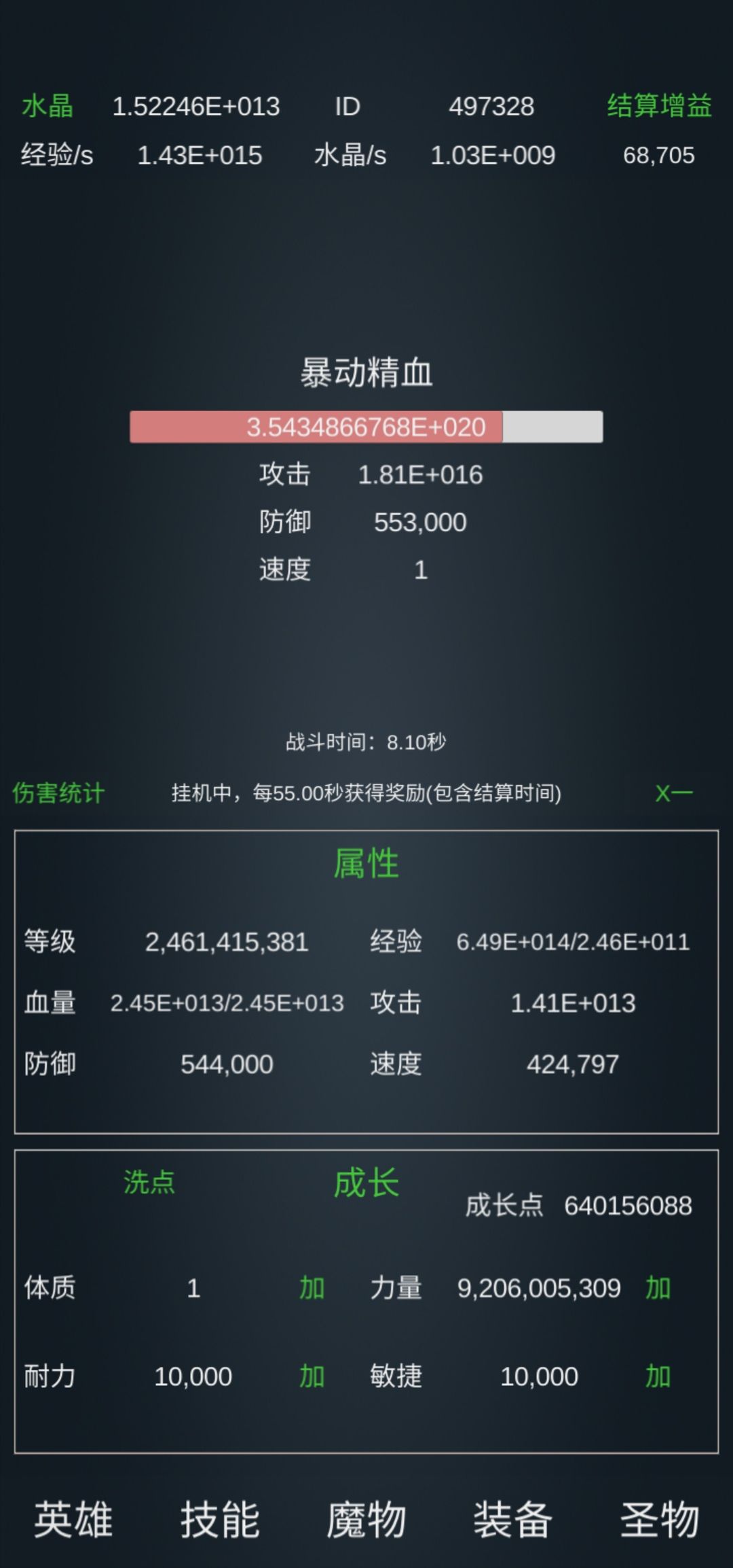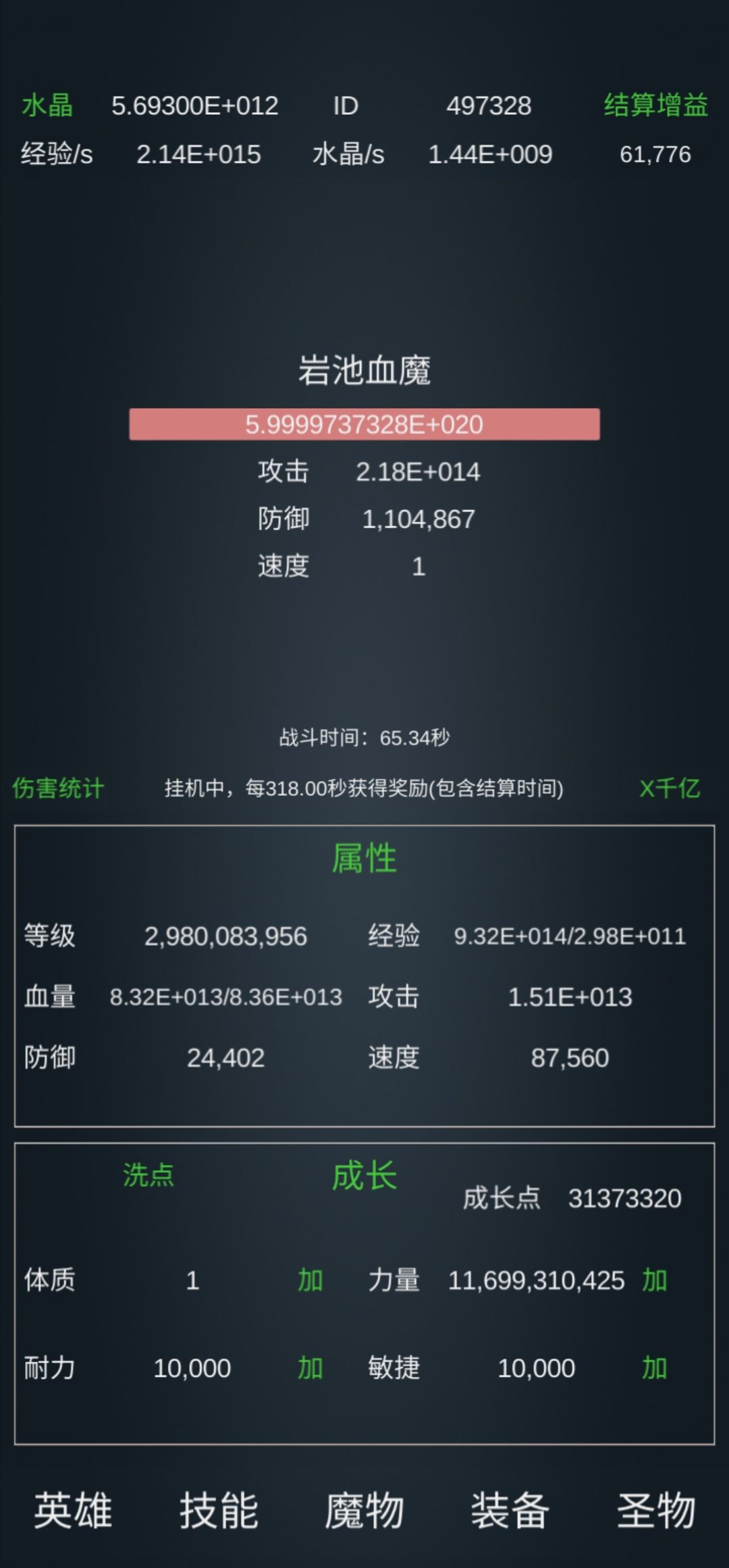 130亿级左右。 技能: 基础:10万亿级力量强化,万亿级耐力,千亿级敏捷(可重置)。 霸者:斩击万亿、嗜血一击千亿、霸体1.2万亿、重锤百亿,霸盾、招架、破碎一击各10亿级。 暗影(可完全不学):弱点暴露千亿,手里剑、与影随行和观察各百亿级,迷踪10亿级。 元素:火球、流星千亿,飞弹百亿,充能千亿,冰封(很强)、元素空间、元素盾百亿级。 转化、爆破10亿。 圣者:圣罚百亿,圣光千亿级,