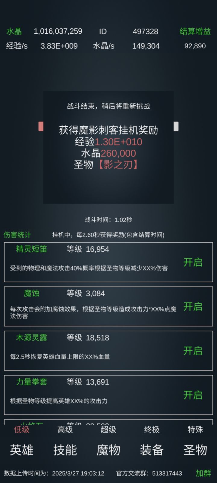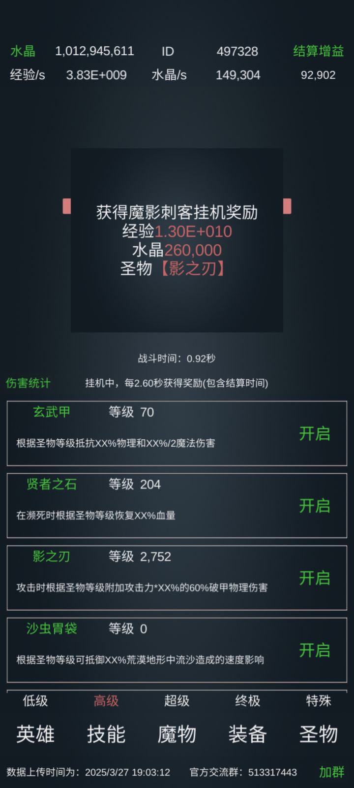 加点、技能、装备和圣物如图。耐力训练和敏捷训练各1百万级,元素盾30万级,其余没提到的全部为0级。要拼一点运气,不过这个配置几分钟就可以过。实际应该不用这么高,元素盾的等级可以低10甚至20万级都可以,我是挂了一整天的鸡才来打的,水晶比较富裕。