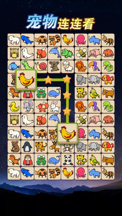 《宠物连连看》是一款消除类休闲游戏,关卡丰富画风精简可爱,点击图案相同的两个小动物即可将它们消除,在规定时间内将游戏中的动物消除完,即可通关。