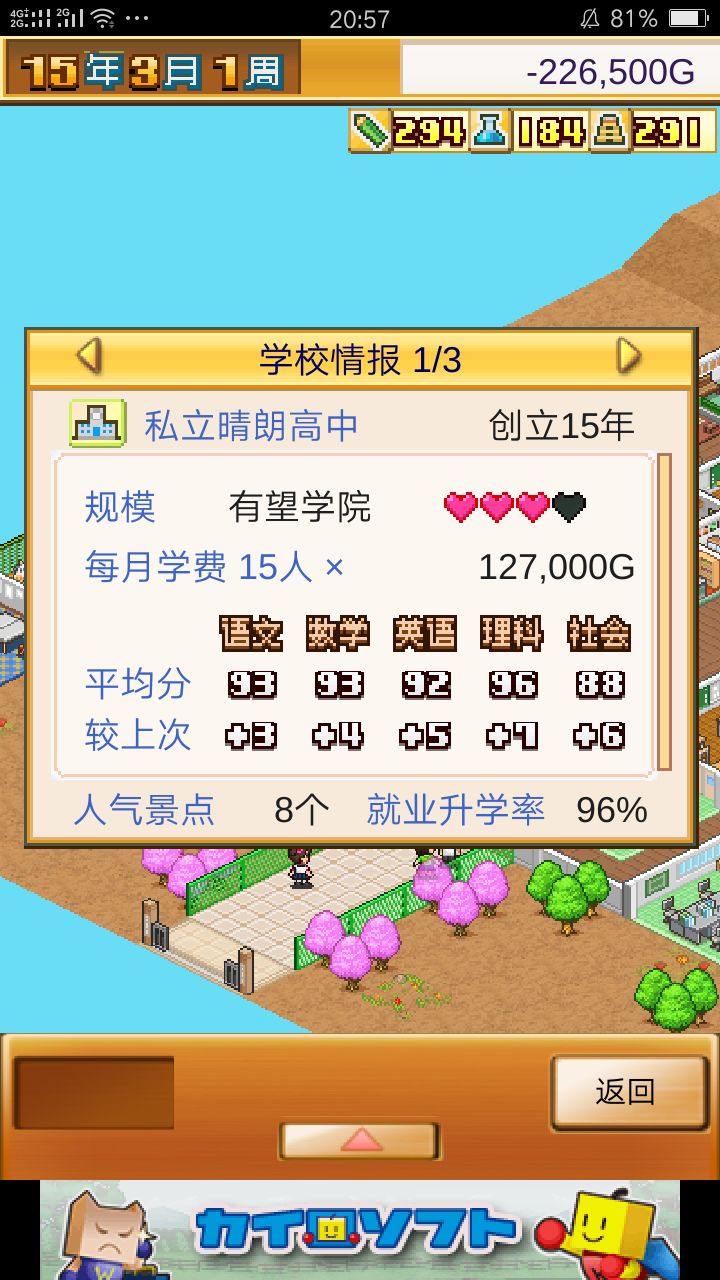 提升教师力可以影响学生成绩。后期逐渐选择出高教学力的老师,即使不用对学生特别授课,每次考试排名都可以在前三浮动。 晒晒我学生的成绩。。。。学校到现在已经过了30多年。。。我这两天也是够沉迷了。。