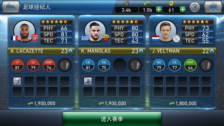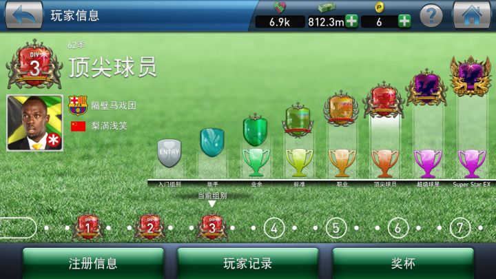 开始苹果玩后来换手机没玩了,让后发现数据能转安卓又继续了,断断续续的玩了这么久,玩的得最长的游戏。每天5场球,喜欢看3D。0氪,职业以前签一两个6星就可以,5星为主。不追求数质,够用就行。主要是训练,5星也能练到100+。主要注意更新换代。一个位子年龄29左右就要签新人开始训练了。