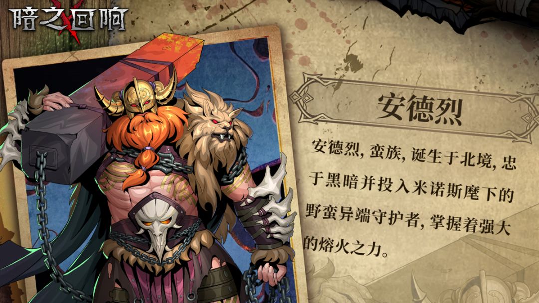 >>>加入《暗之回响》官方QQ讨论群:328295822 >>>基础信息 【名字】安德烈 【阵营】异端 【职业】守护者 【能力】操控熔岩 >>>传闻 【传闻I】野蛮异端 安德烈,蛮族,诞生于北境,忠于黑暗并投入米诺斯麾下的野蛮异端守护者。 【传闻II】熔火之力 在熔火之力的加持下,安德烈能与一整支帝国军团对战。 【传闻III】熔火之柱 根据一些秘闻得知,安德烈随身背负的熔火之柱来自熔浆领域中危险的