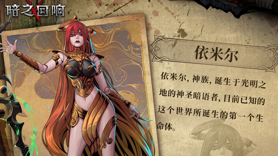 >>>加入《暗之回响》官方QQ讨论群:328295822 >>>基础信息 【名字】依米尔 【阵营】神圣 【职业】暗语者 【年龄】不详 【力量】拥有强力的法术伤害手段,强度不详 >>>传闻 【传闻I】原初生命体 传说中依米尔是诞生于光明之地的神圣暗语者,是这个世界目前已知的第一个生命体。 【传闻II】人偶 依米尔的灵魂现在寄宿于毫无情感的人偶中。祂褪去的躯壳如同过往的无尽岁月,已无从考究。 【传闻I
