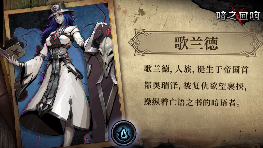 >>>加入《暗之回响》官方QQ讨论群:328295822 >>>基础信息 【名字】歌兰德 【阵营】异端 【职业】暗语者 【能力】亡灵操纵 >>>传闻 【传闻I】亡语之书操纵者 歌兰德,人族,诞生于帝国首都奥瑞泽,被复仇欲望裹挟,操纵着亡语之书的暗语者。 【传闻II】面具背后 亡语牧诗的名字、异端暗语者的身份、骇人面具背后的容貌,这些至今仍是个谜团,但却丝毫无法减少她散发的恐惧感。 【传闻III】黑