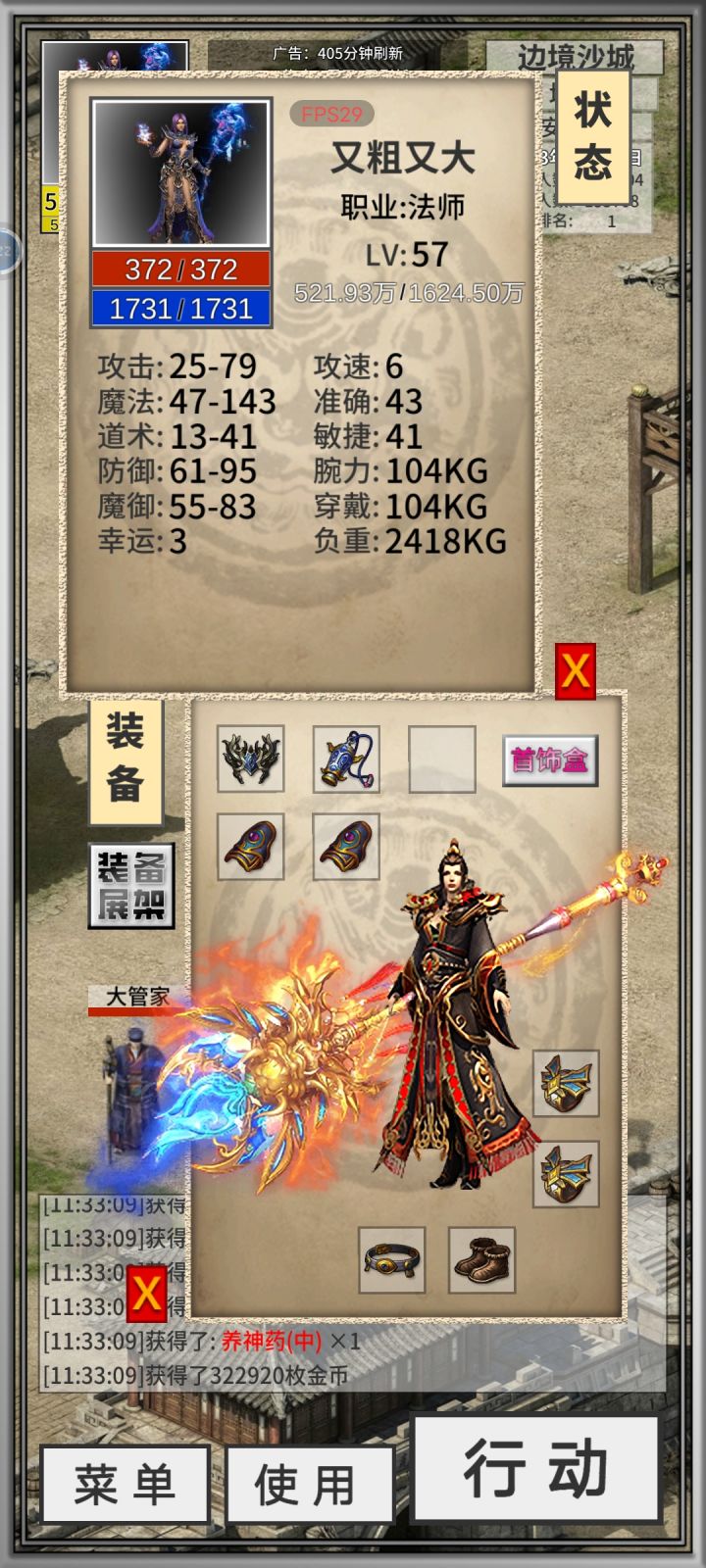 基础篇:1、开局刷九鼎戒指,骷髅大领主掉落,别问为什么刷九鼎,没九鼎玩这游戏就是坐牢,药水带不了几个负重就没了,打怪刚打两分钟背包又没负重了,最关键的是没药水离线时间太短,这游戏红蓝药水就是离线挂机时间战士三四级学了两级基础剑法就能打,看广告,用广告点数直接打骷髅,十次一般都能出个九鼎,倒计时24小时结束前爆率极高,不出就删号重来道士同理,三四级学了精神力和回春术就能打过,不出删号重来法师