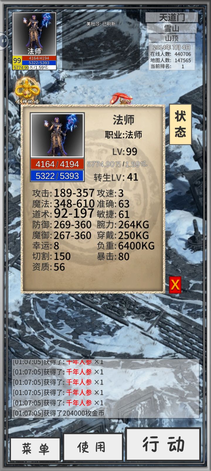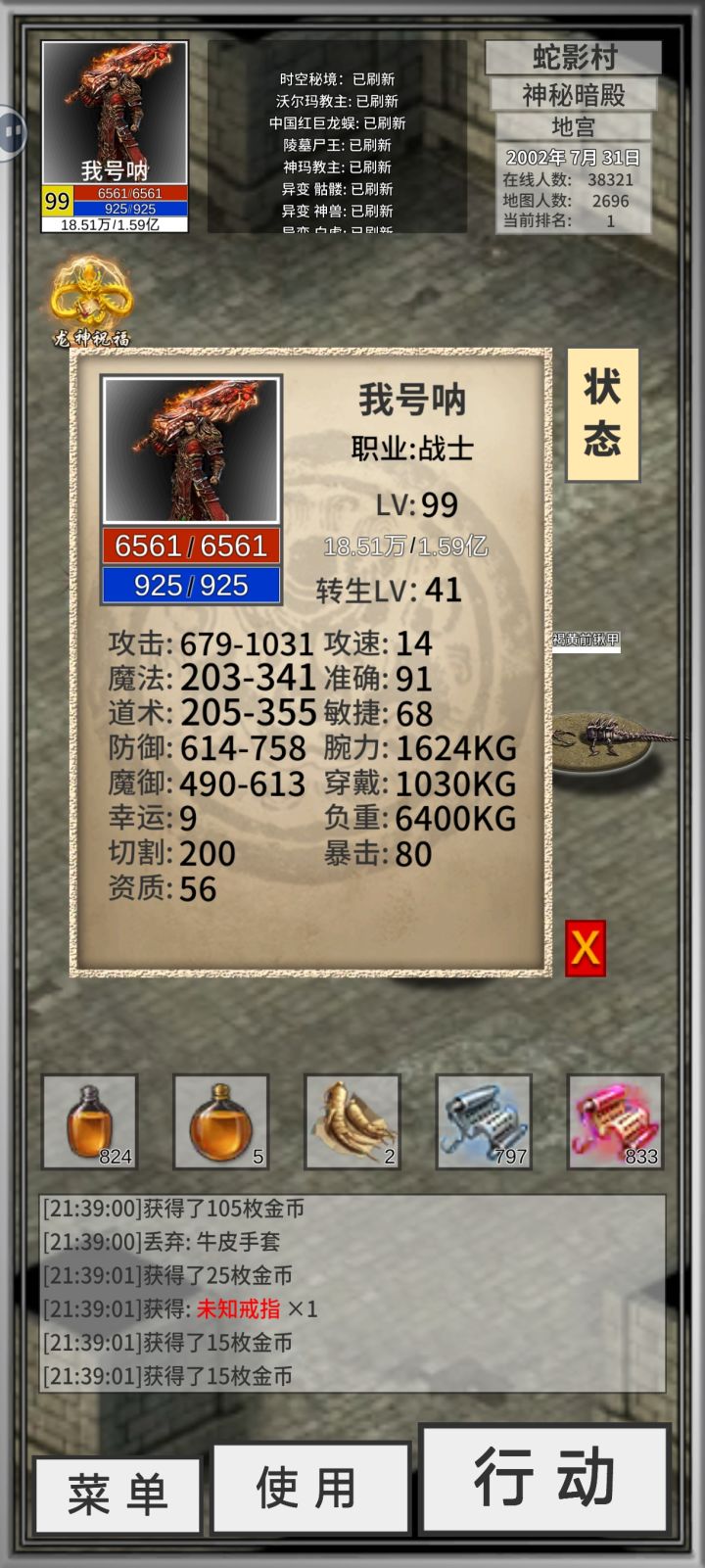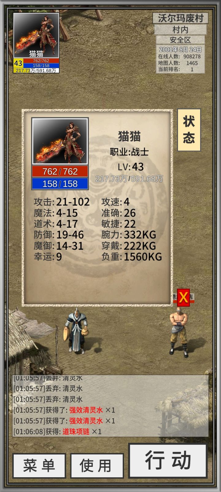 基础篇:1、开局刷九鼎戒指,骷髅大领主掉落,别问为什么刷九鼎,没九鼎玩这游戏就是坐牢,药水带不了几个负重就没了,打怪刚打两分钟背包又没负重了,最关键的是没药水离线时间太短,这游戏红蓝药水就是离线挂机时间战士三四级学了两级基础剑法就能打,看广告,用广告点数直接打骷髅,十次一般都能出个九鼎,倒计时24小时结束前爆率极高,不出就删号重来道士同理,三四级学了精神力和回春术就能打过,不出删号重来法师